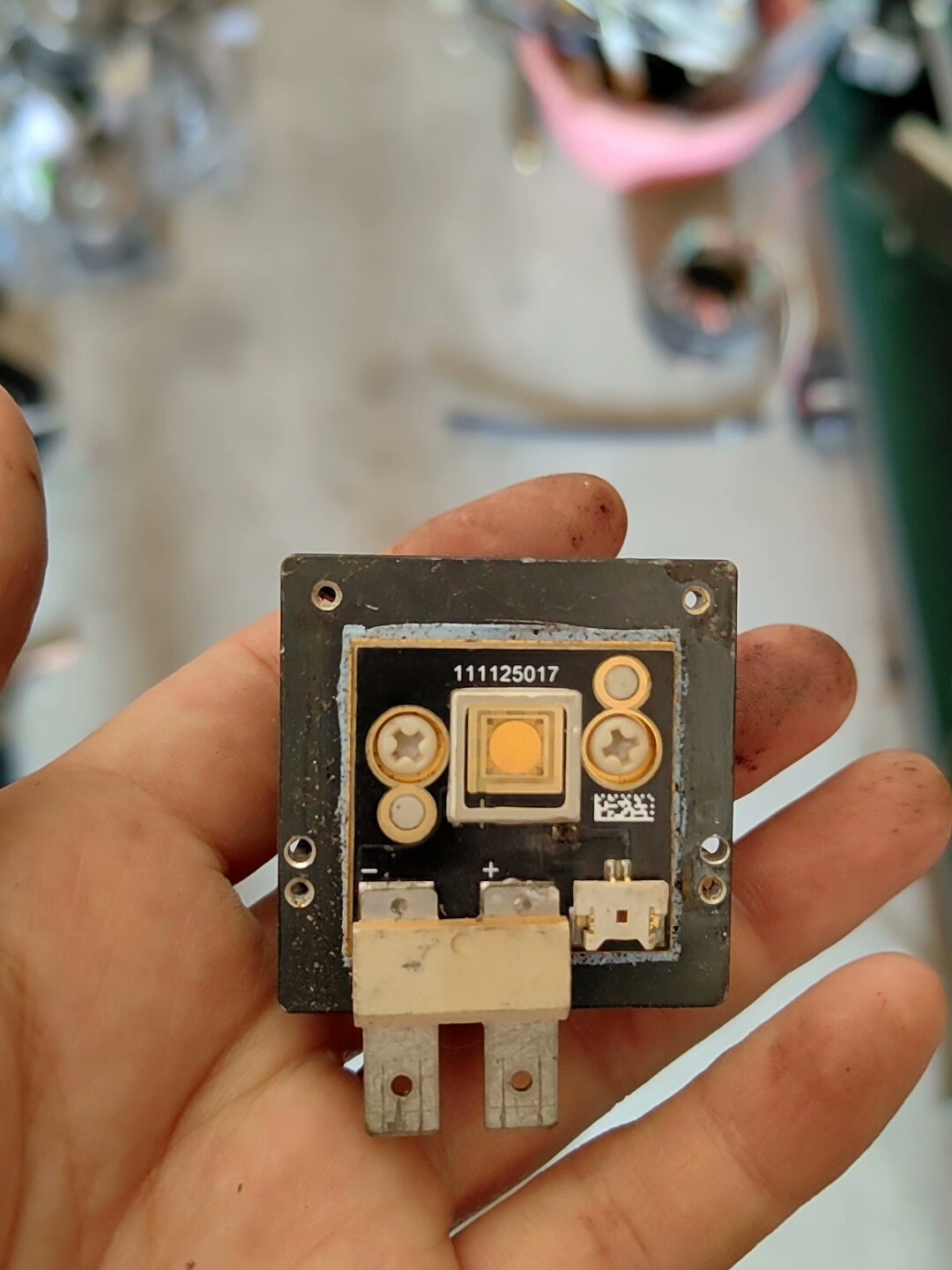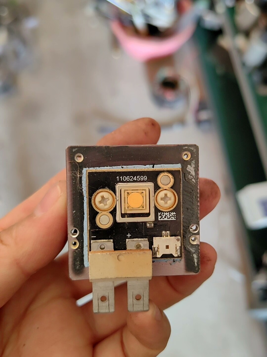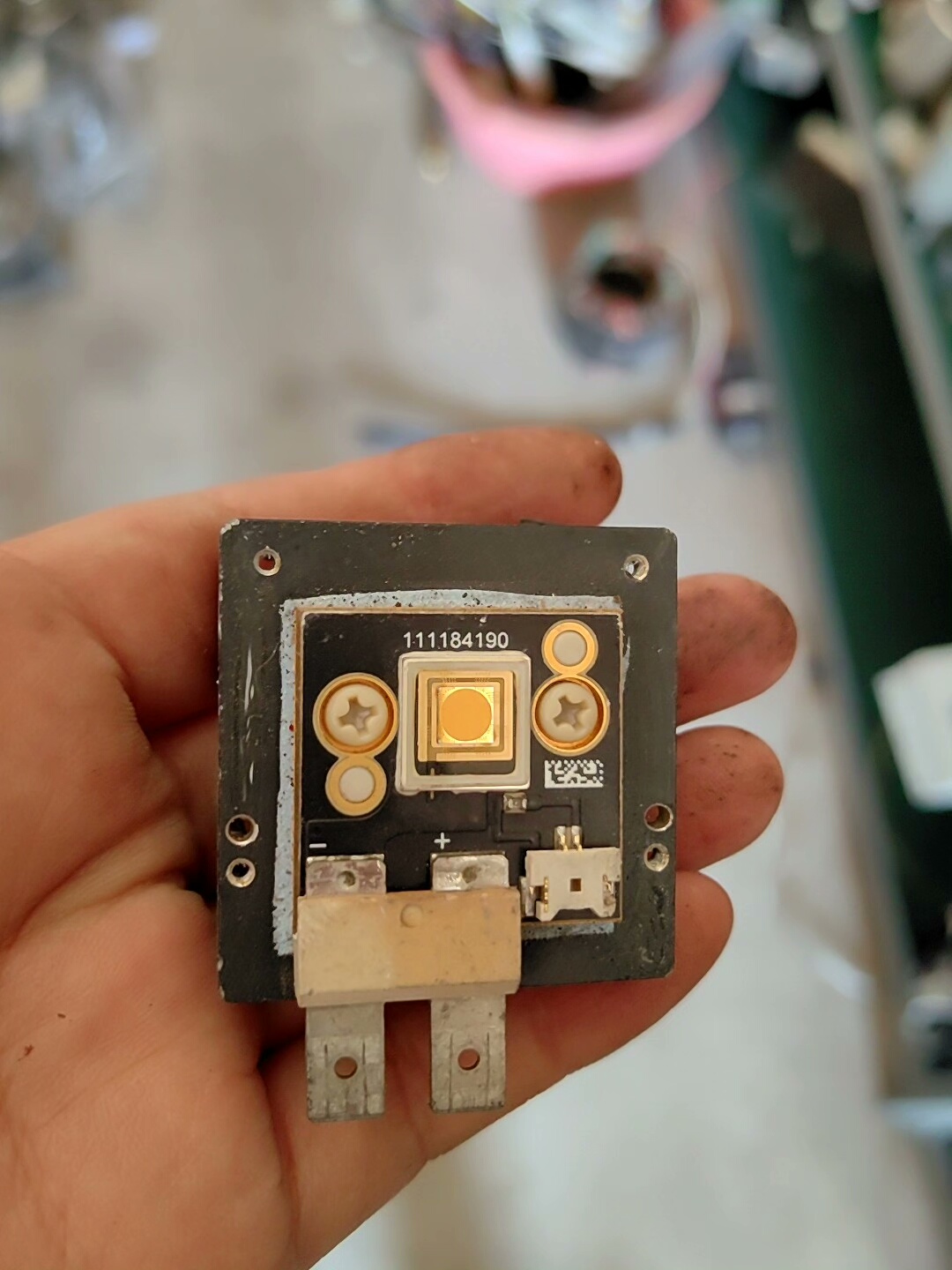 本产品为未知品牌QS1、QS3、QS5系列LED灯光源,型号包含111233008。采用黑色方形模块设计,集成散热结构,确保长时间稳定运行。中央黄色LED芯片提供高效照明,周围金属触点及固定螺丝设计,便于安装与电路连接,整体结构紧凑,适配多种工业设备及照明场景。