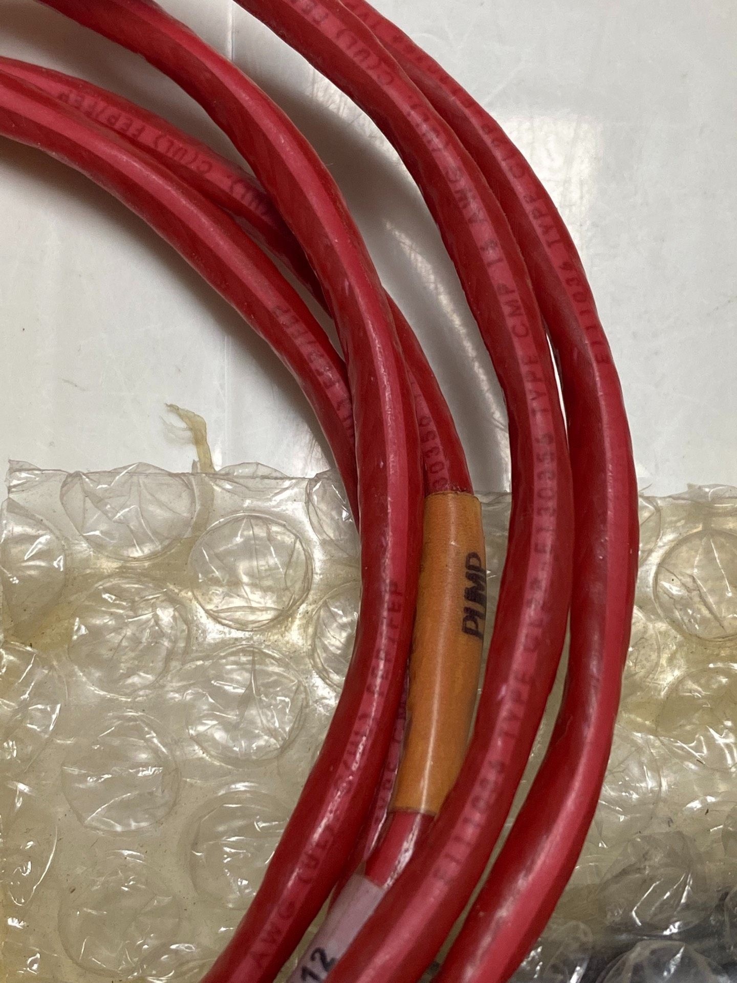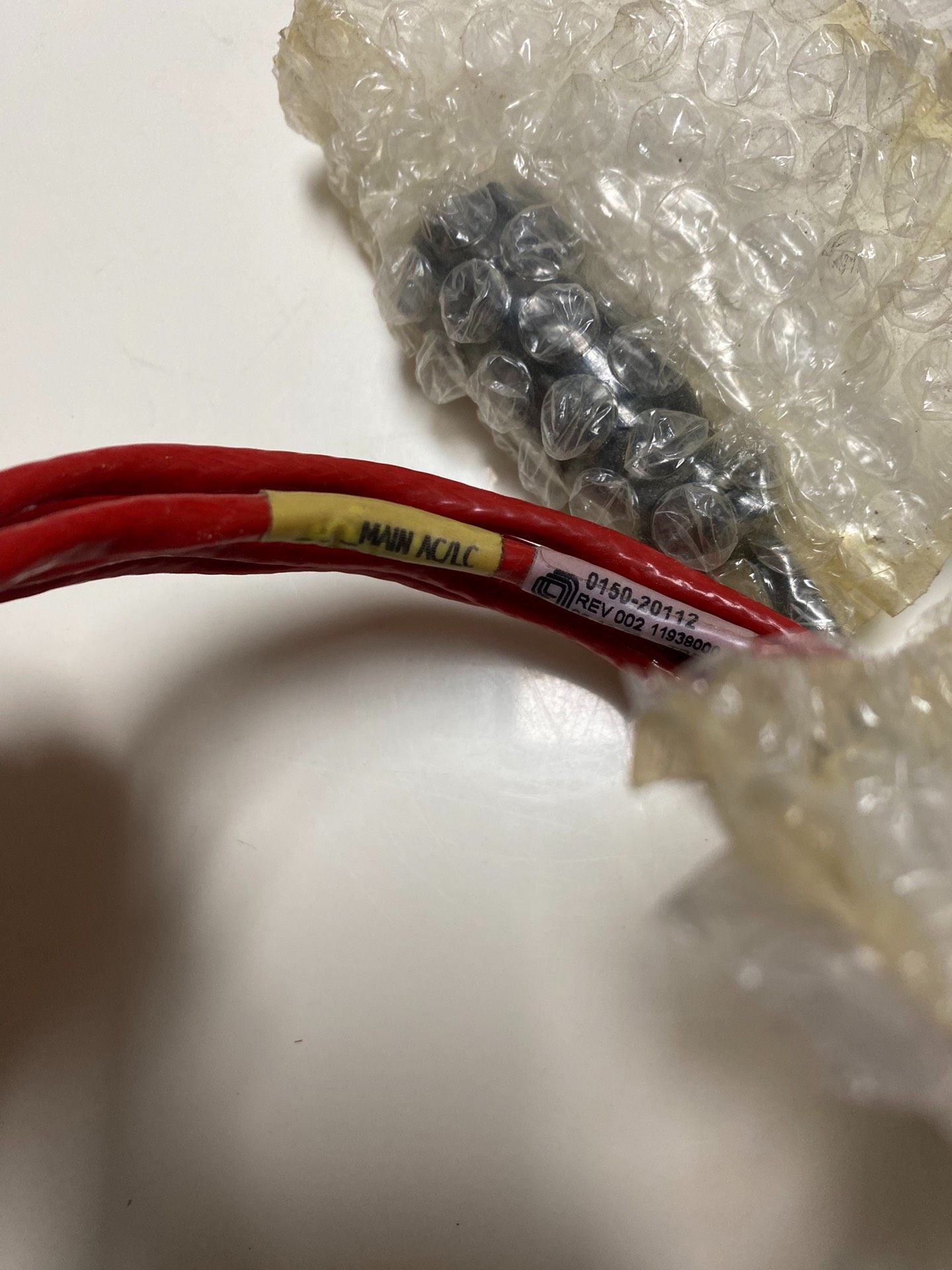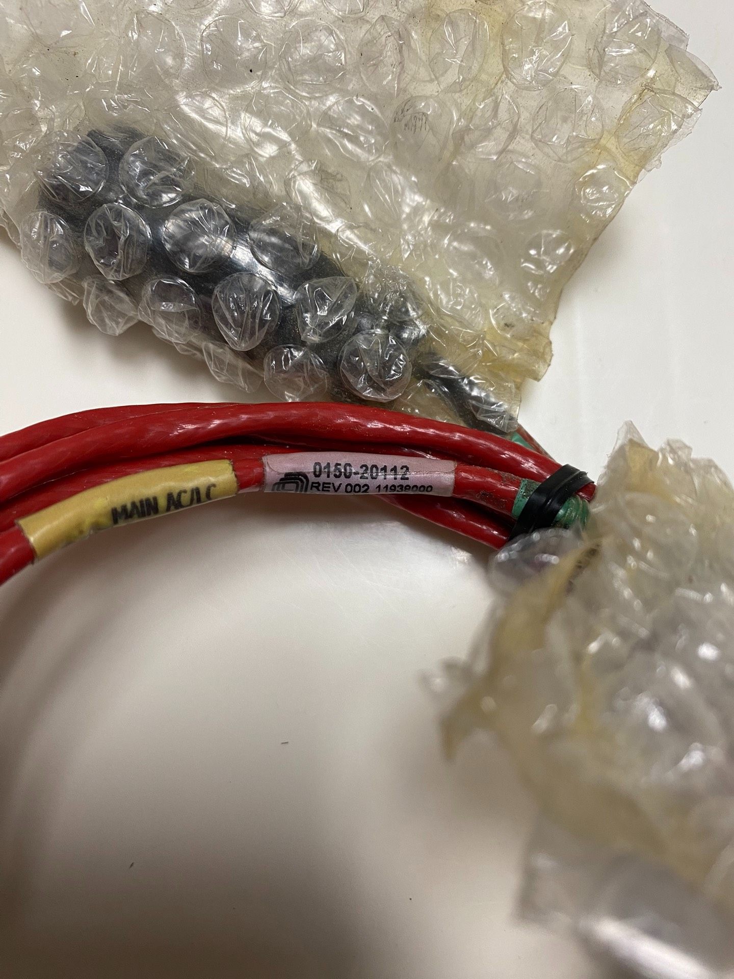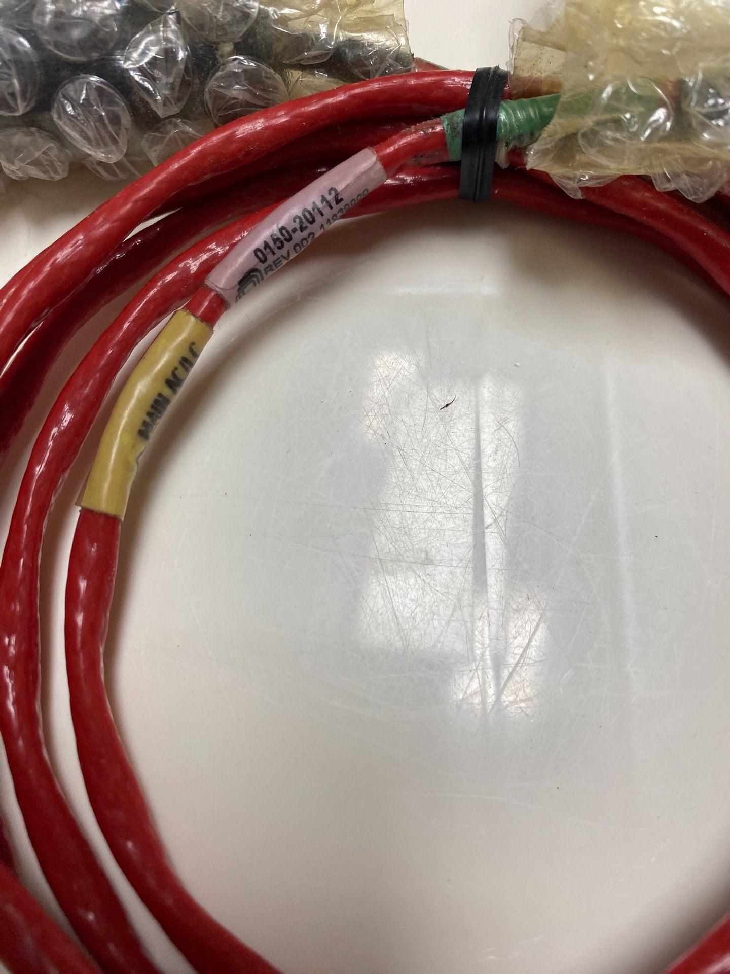 本产品为AMAT品牌工业电缆,型号为0150-20112 REV 002,序列号11938000,全新未使用状态,无原包装。产品整体呈红色,电缆部分螺旋缠绕,两端配有连接器,连接器区域采用气泡膜保护,确保运输和存储过程中的安全性。