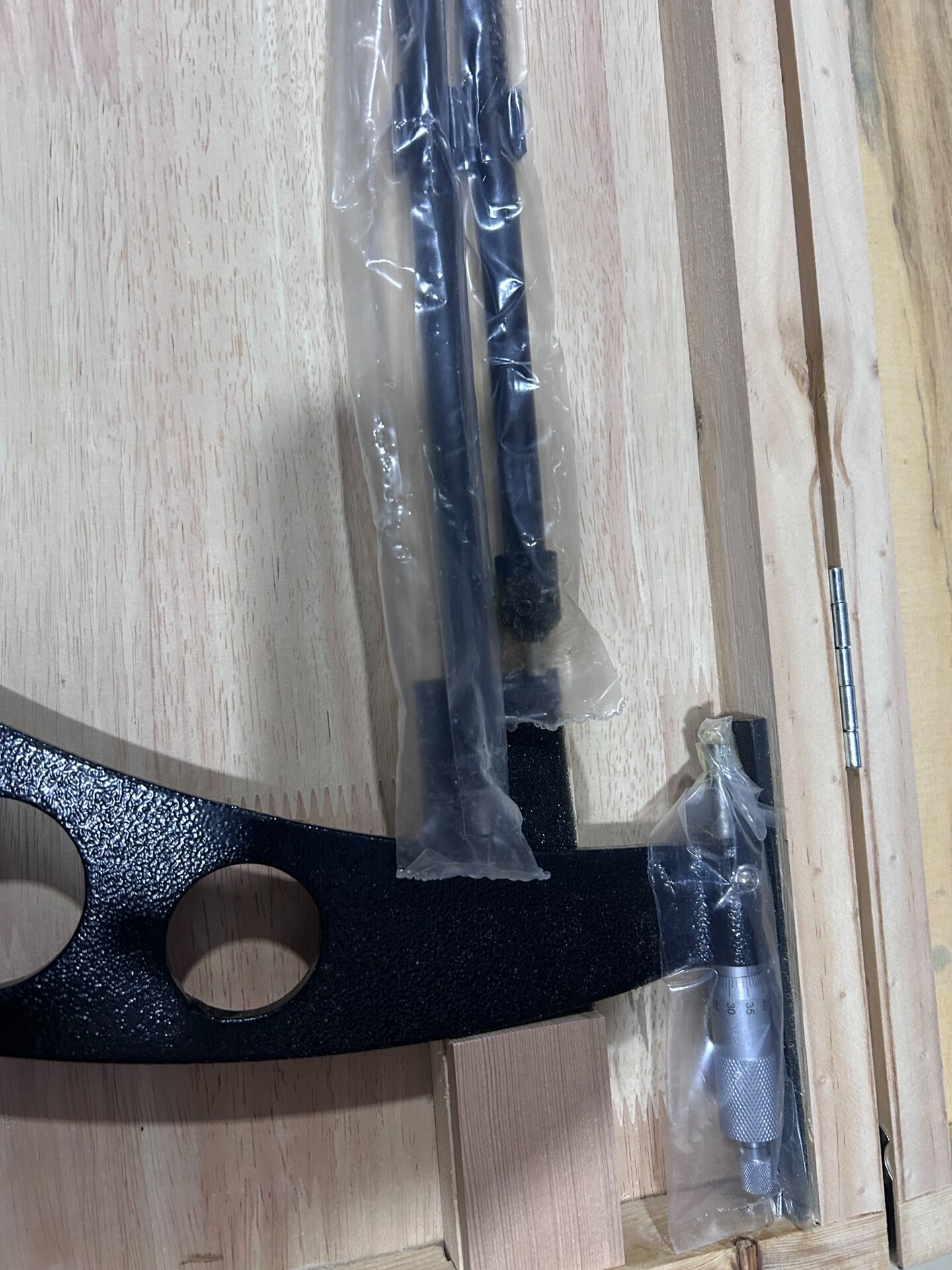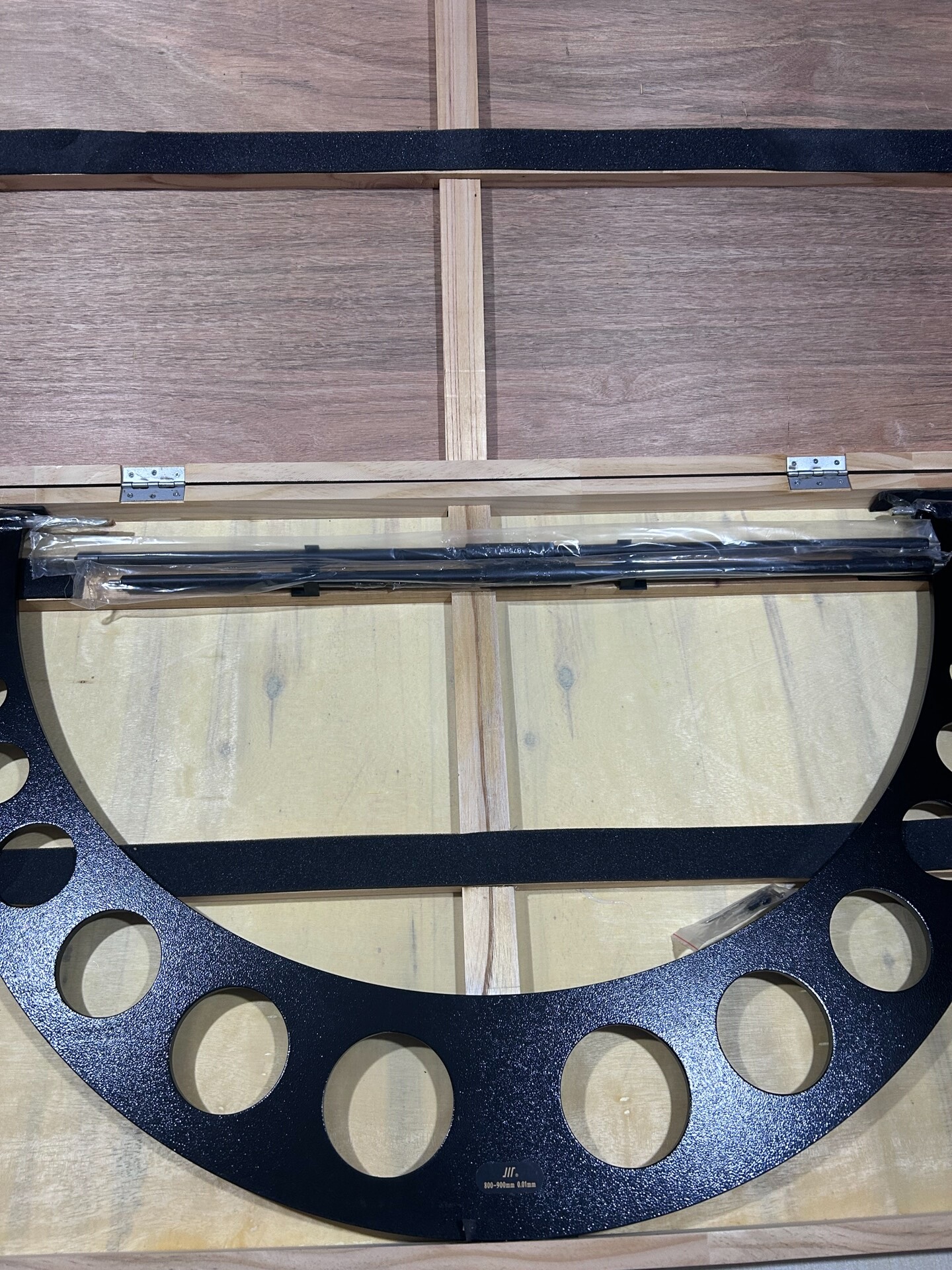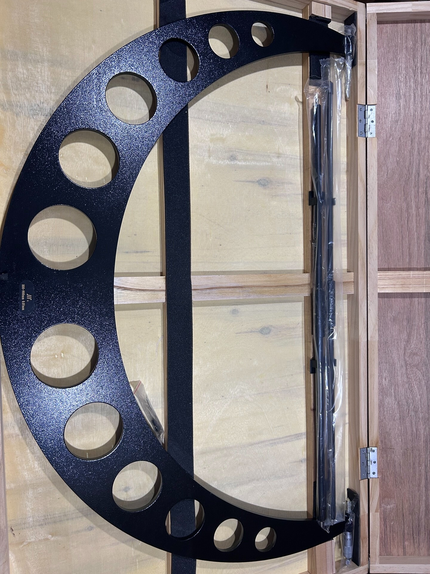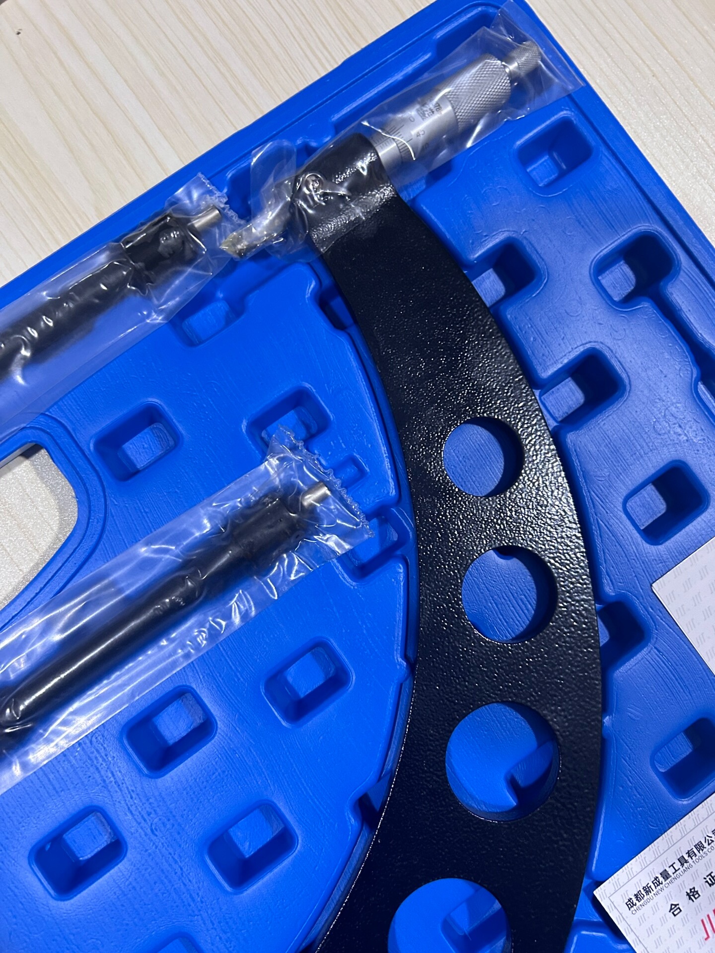 成量外径千分尺采用高精度测量结构设计,主体框架为黑色磨砂表面,具备优良的耐磨性与抗腐蚀性。框架上分布多个圆形通孔,在减轻整体重量的同时确保了测量时的结构稳定性,适用于各类大尺寸工件的外径精确测量场景。