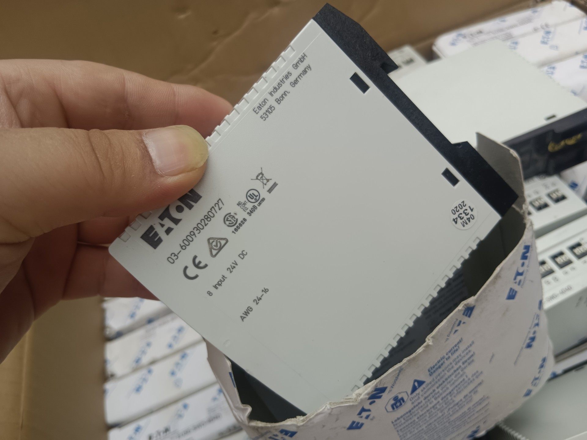 该模块出厂时已封装于原厂纸盒内,标签清晰标注了产品信息、序列号、生产日期(2020年3月)及CE认证标志,确保正品行货。适合需要扩展数字输入点数的各类PLC系统集成项目。