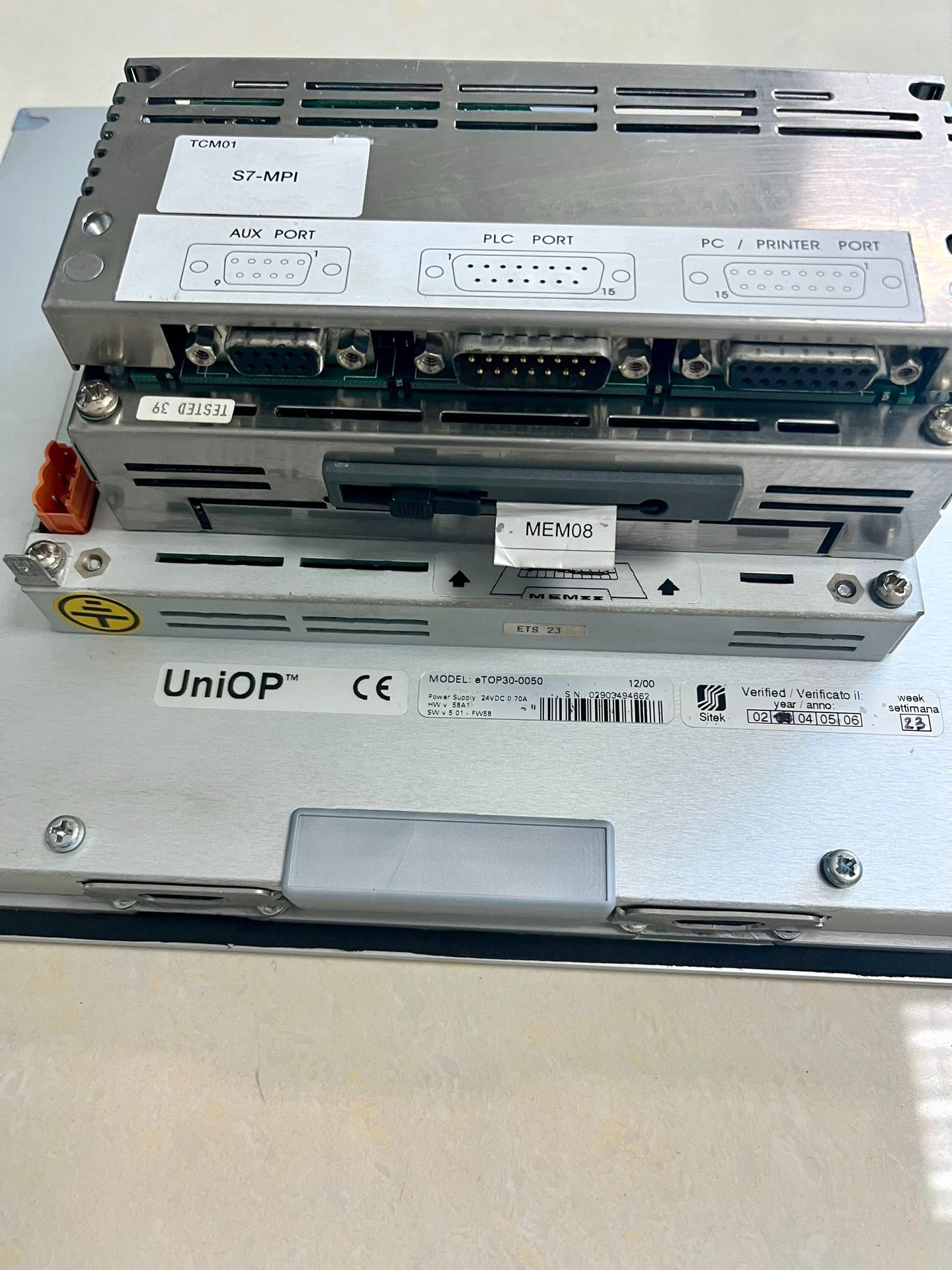 本产品为UniOP品牌旗下的ETOP30-0050型号触摸屏,专为工业自动化控制系统设计,具备高稳定性和良好的人机交互体验。从图片可见,该触摸屏采用银色金属外壳,整体结构紧凑,安装于墙面或控制柜中均适用。