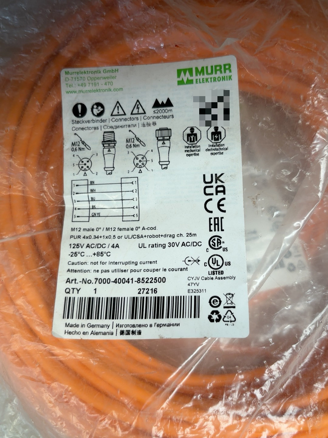 产品详情:MURR穆尔M12工业连接线