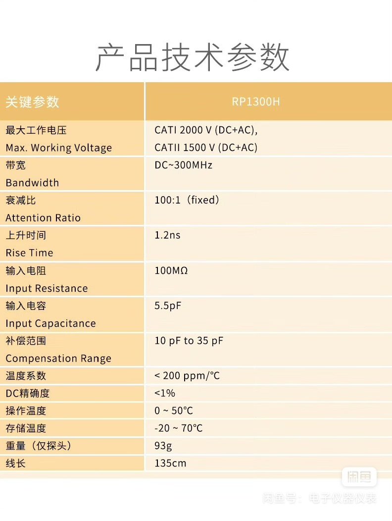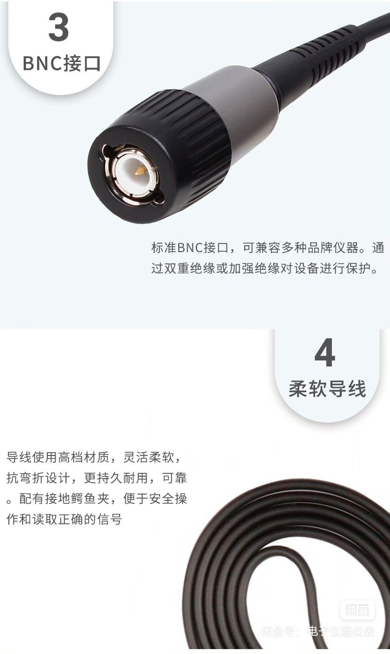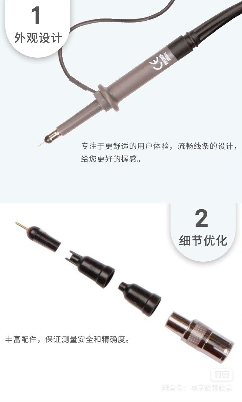 - 配件包含:探针头、绝缘环、接地夹等