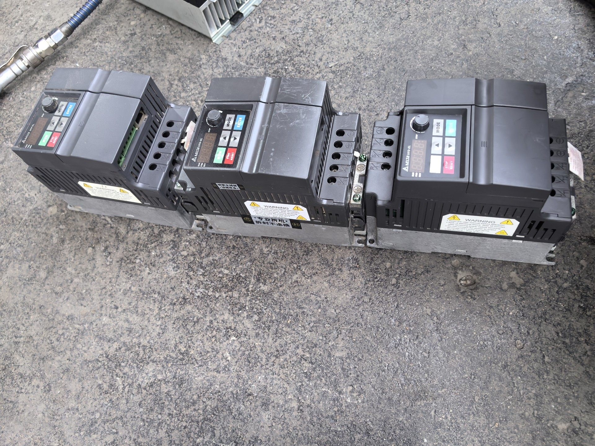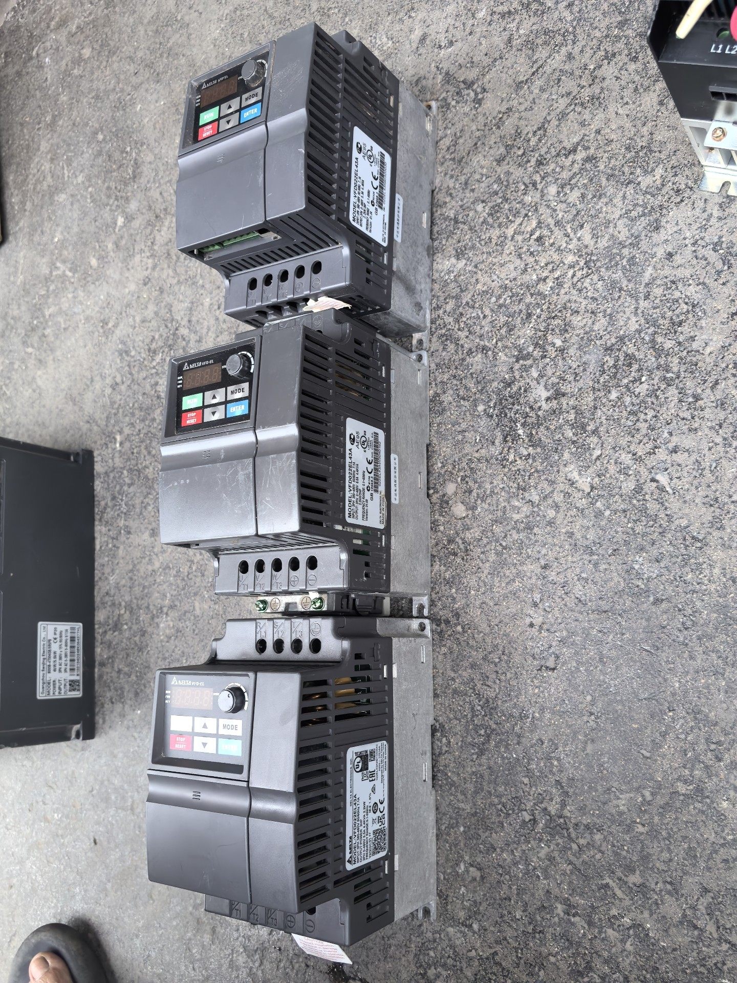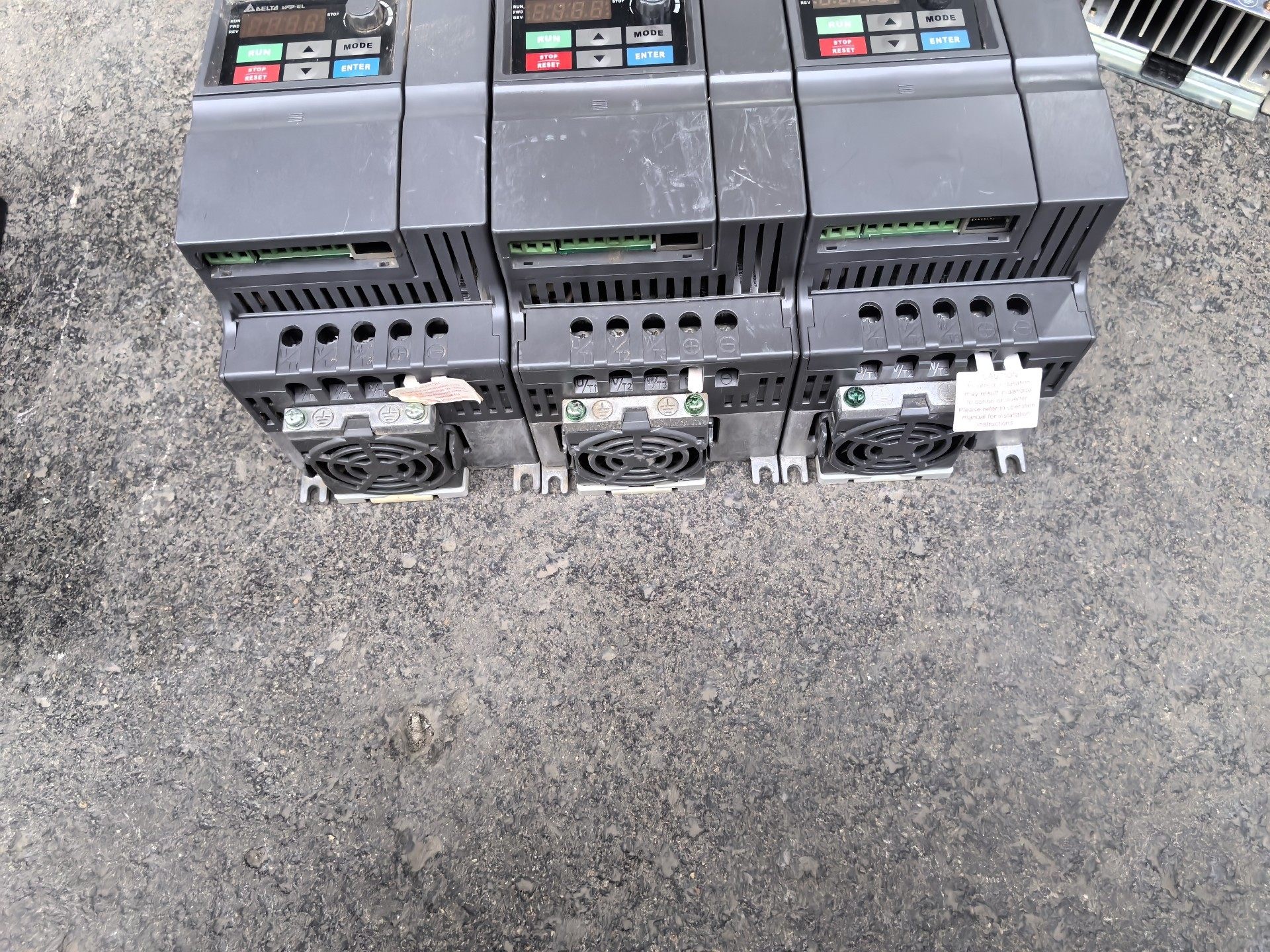 本产品为台达(Delta)品牌旗下的VFD022EL43型号变频器,是工业自动化控制系统中常用的电机调速设备。图片展示了三台并排摆放的变频器,外观整洁,成色良好,功能正常,适合用于各类工业应用场景。