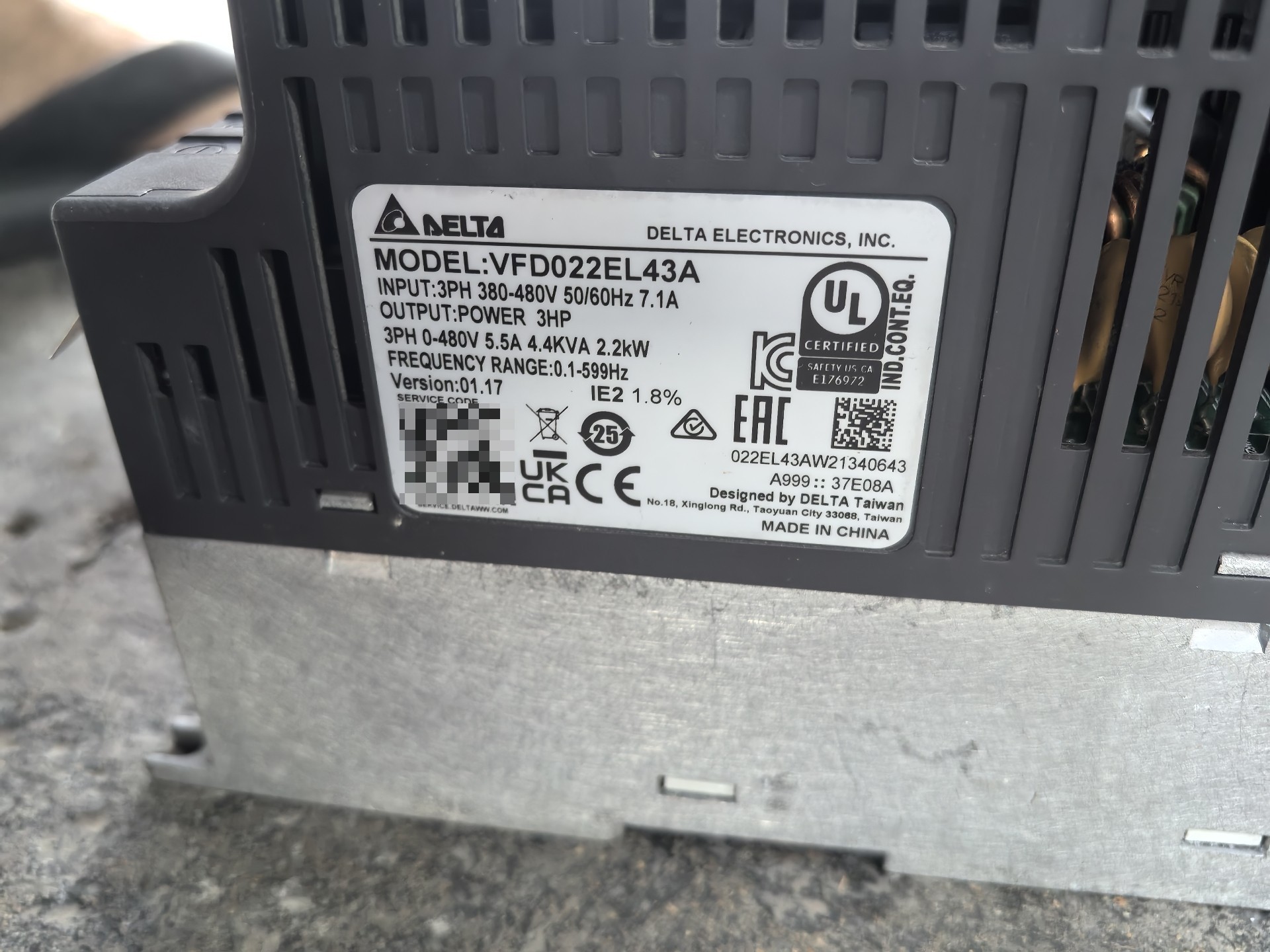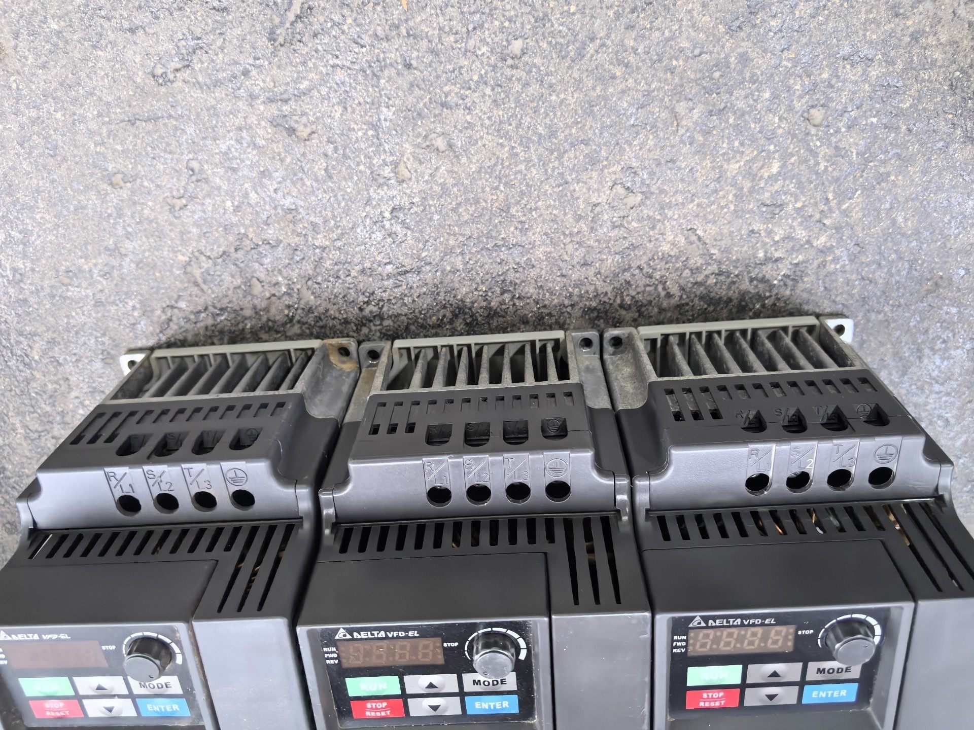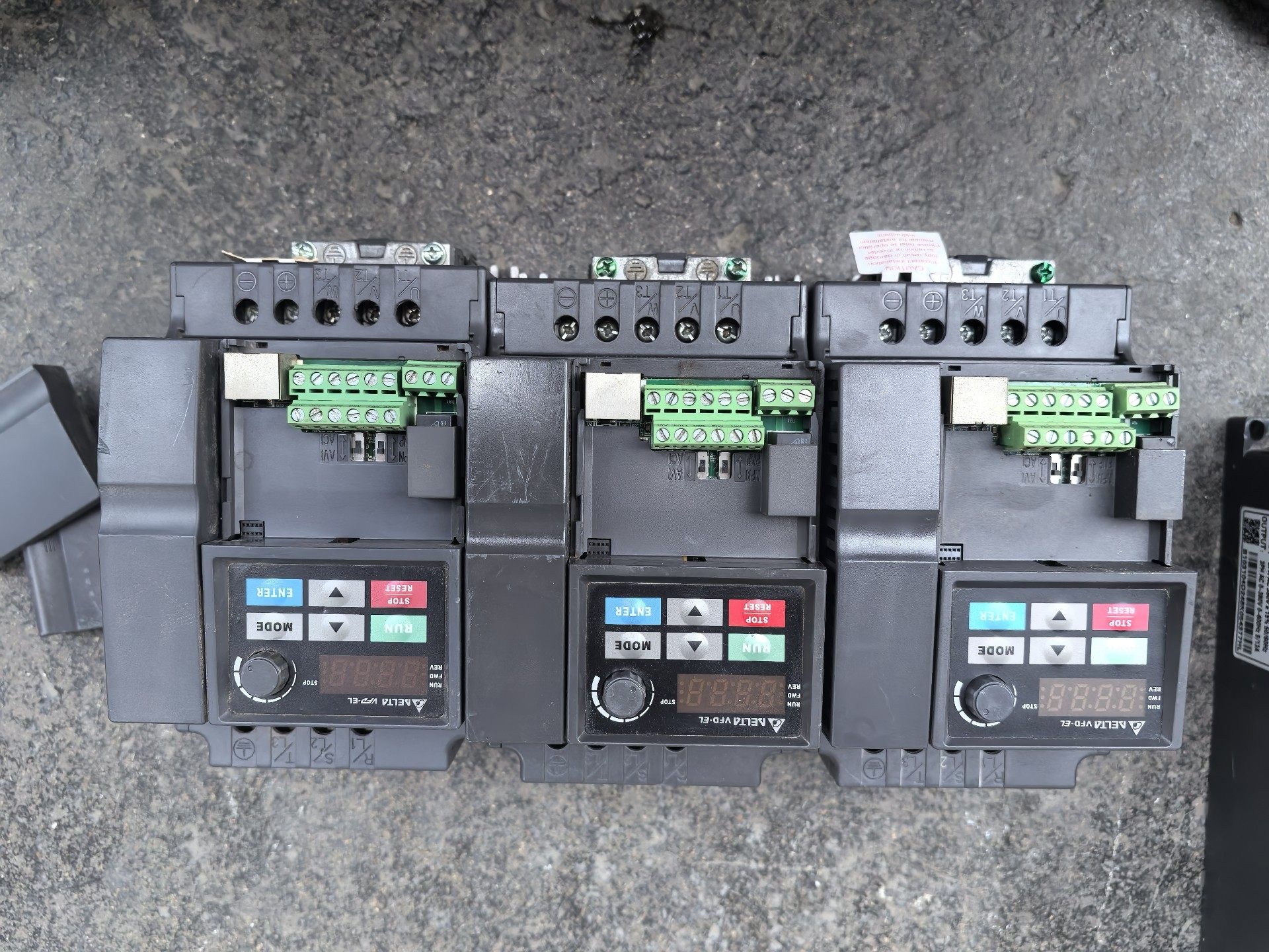 本产品为台达(Delta)品牌旗下的VFD022EL43型号变频器,是工业自动化控制系统中常用的电机调速设备。图片展示了三台并排摆放的变频器,外观整洁,成色良好,功能正常,适合用于各类工业应用场景。