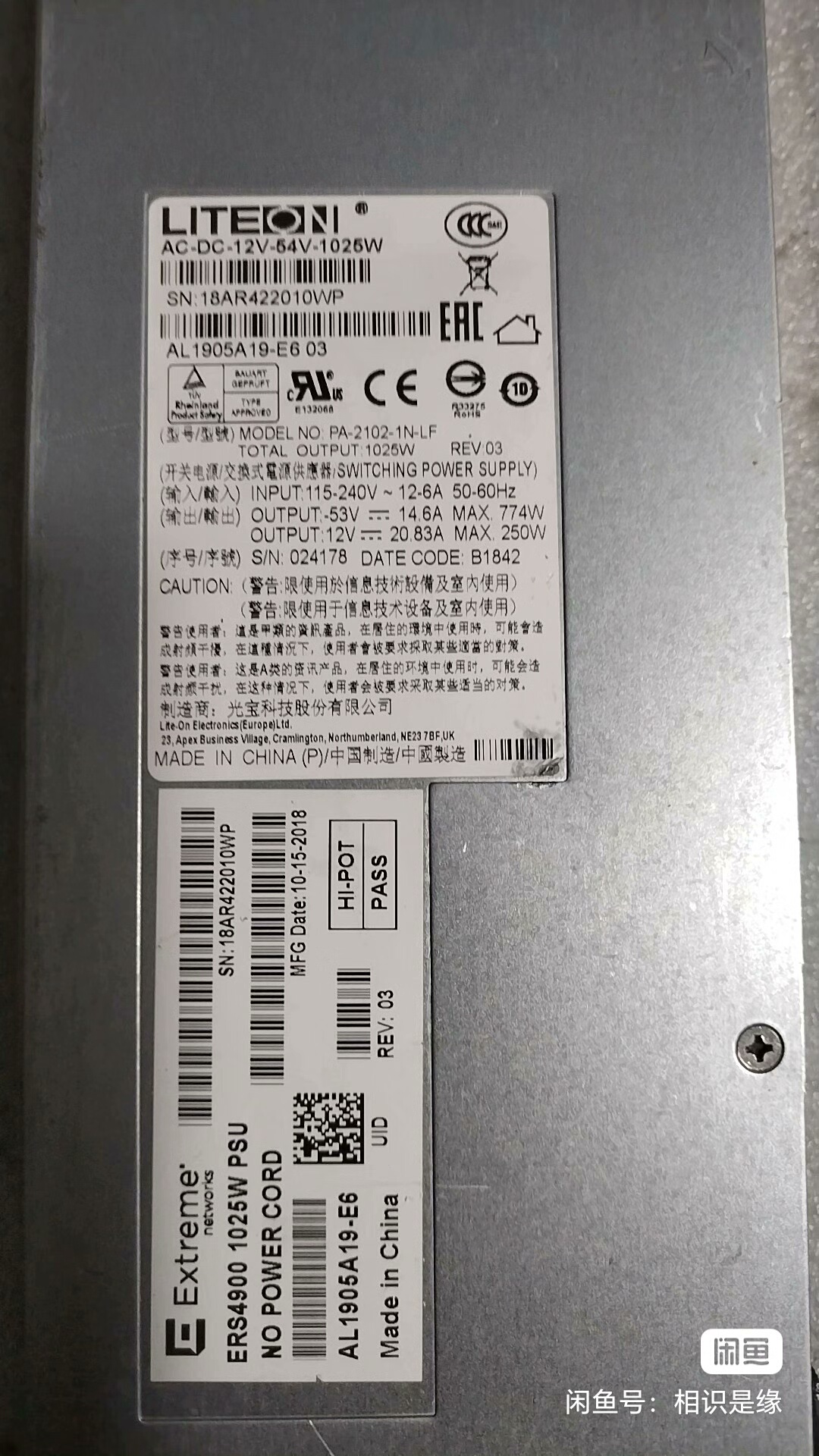 本产品为LITEON(光宝)原装正品交换机电源模块,型号PA-2102-1N-LF,设计用于为网络交换机等设备提供稳定可靠的电力支持。采用银色金属外壳,结构坚固,具备良好的散热性能;配备黑色接口和便捷提手,安装与维护方便。产品成色良好,经过功能测试,确保输出稳定,满足设备长期运行需求。