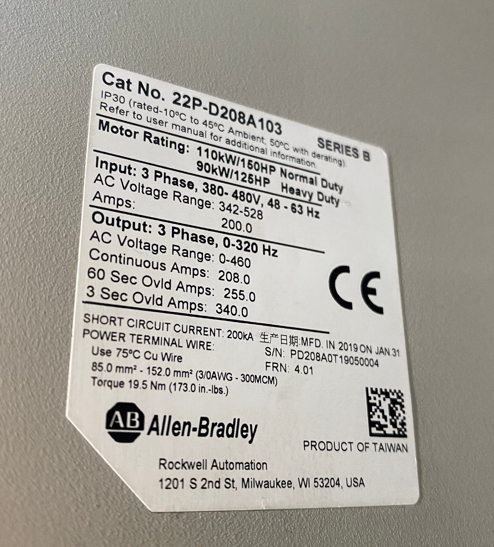 Allen-Bradley PowerFlex 400P系列变频器(型号22P-D208A103)是一款高性能工业级电机控制设备,专为满足复杂工业环境下的电机调速需求而设计。设备采用灰白黑经典配色,正面集成蓝色背光显示屏和便捷操作面板,包含旋钮、按键及状态指示灯,整体成色漂亮,功能经测试完好,可直接投入工业现场使用。