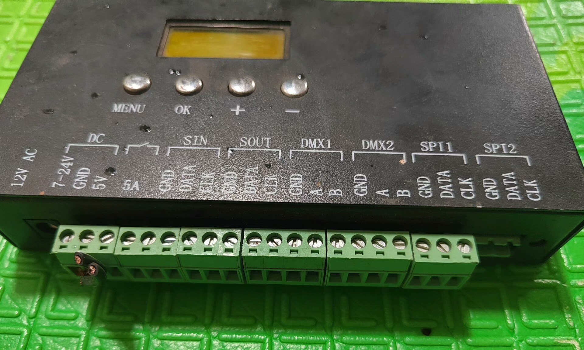 - 外观特征:黑色金属外壳,正面配备一个黄色LCD显示屏和四个操作按钮(MENU、OK、+、-),底部设有绿色接线端子排,便于连接外部设备。