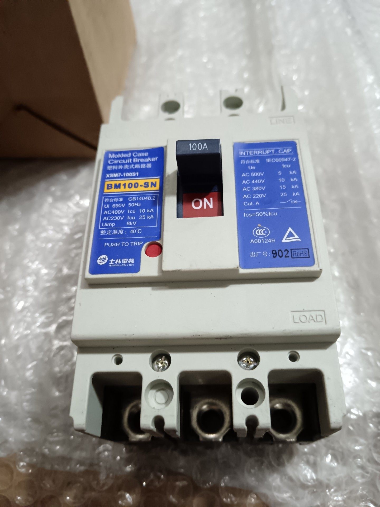 本产品为台湾原装士林(Shihlin Electric)品牌的塑壳式断路器,型号为BM100-SN,额定电流100A,广泛应用于工业配电系统中,提供可靠的过载和短路保护功能。