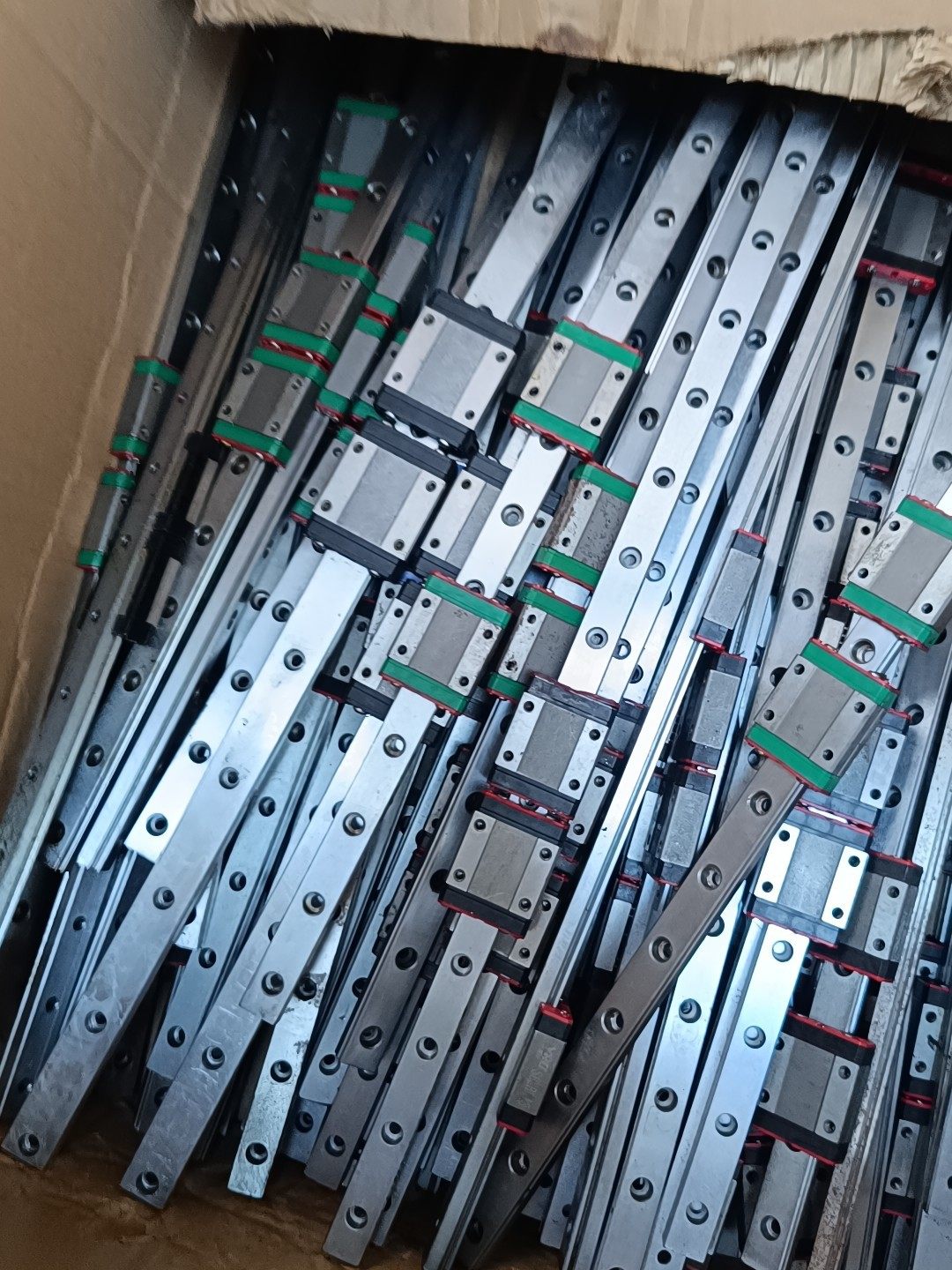本产品为MGN12型号直线导轨滑块,采用高强度银色金属材质制造,结构精密,表面分布均匀安装孔洞,便于快速固定安装。导轨配备专用滑块组件,滑块与导轨配合紧密,运动平稳,确保高精度线性导向。产品通过绿色及红色胶带整齐固定,防止运输过程中滑块脱落或导轨损伤,保证产品完好性。
