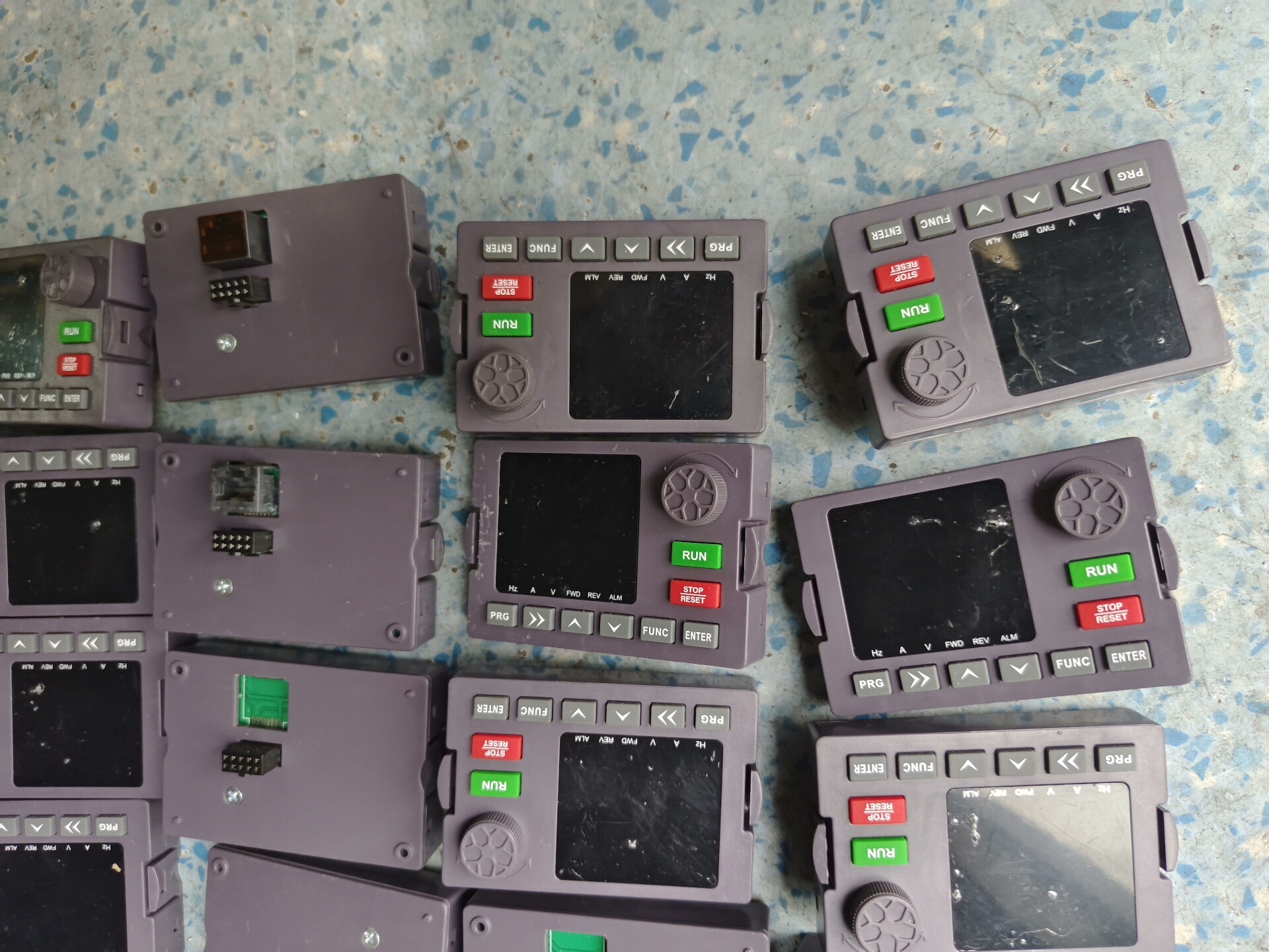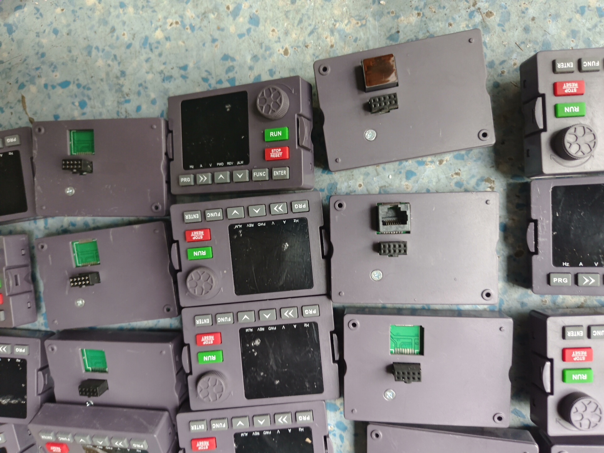 面板上的按键布局合理,包括RUN(运行)、STOP(停止)、FUNC(功能)、ENTER(确认)等常用操作键,以及上下左右导航键,方便用户进行参数调整和监控。部分面板带有绿色和红色指示灯,用于显示工作状态和报警信息。