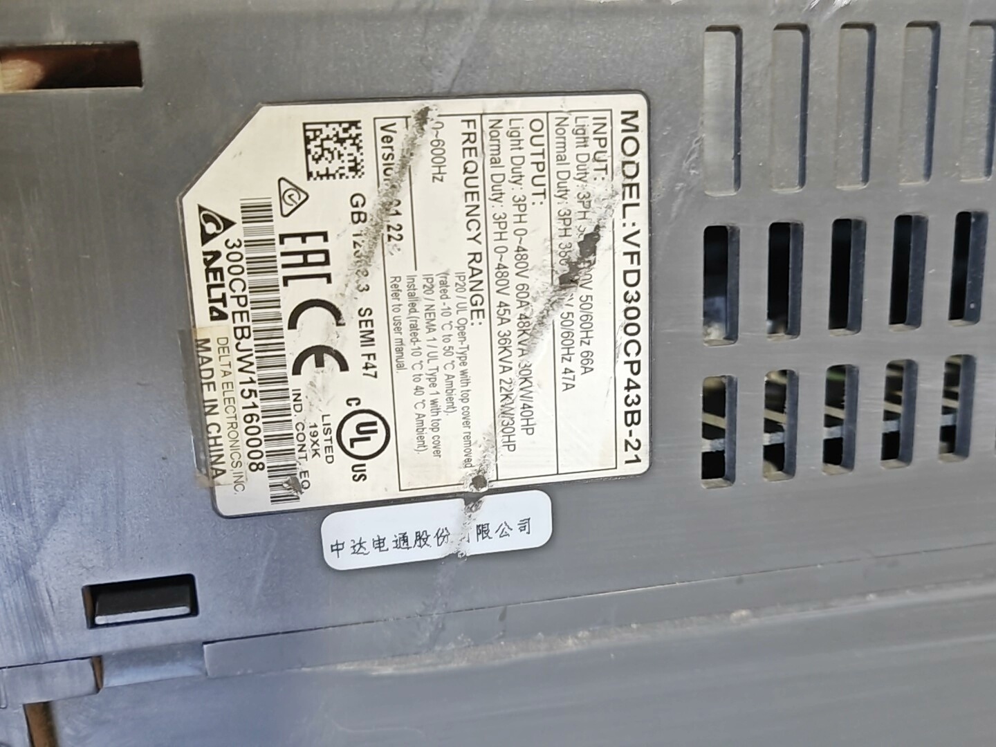 - 品牌与型号:台达(Delta),型号VFD300CP43B-21,属于CP2000系列。
