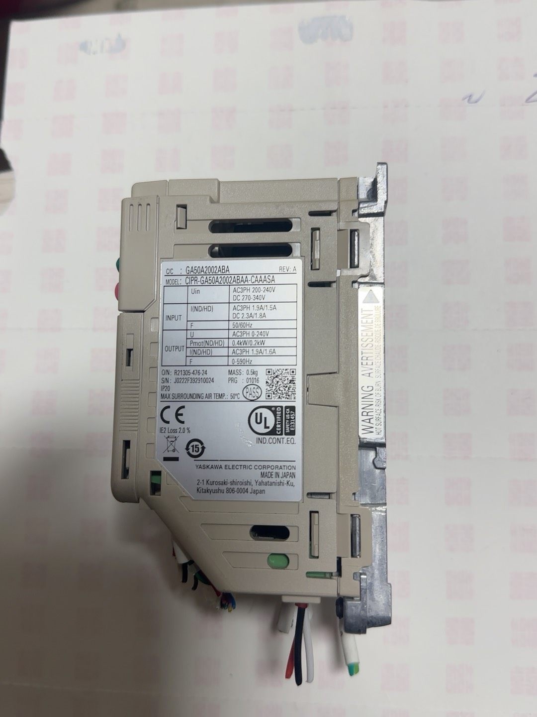 本产品为YASKAWA(安川电机)GA500系列变频器,具体型号为CIPR-GA50A2002ABBA-CAAASA,功率规格为0.4kw/0.2kw。设备外观包含控制按键、显示屏及多组接线端子,成色如图所示,经检测功能完好,可稳定实现电机速度的精准调节与控制。
