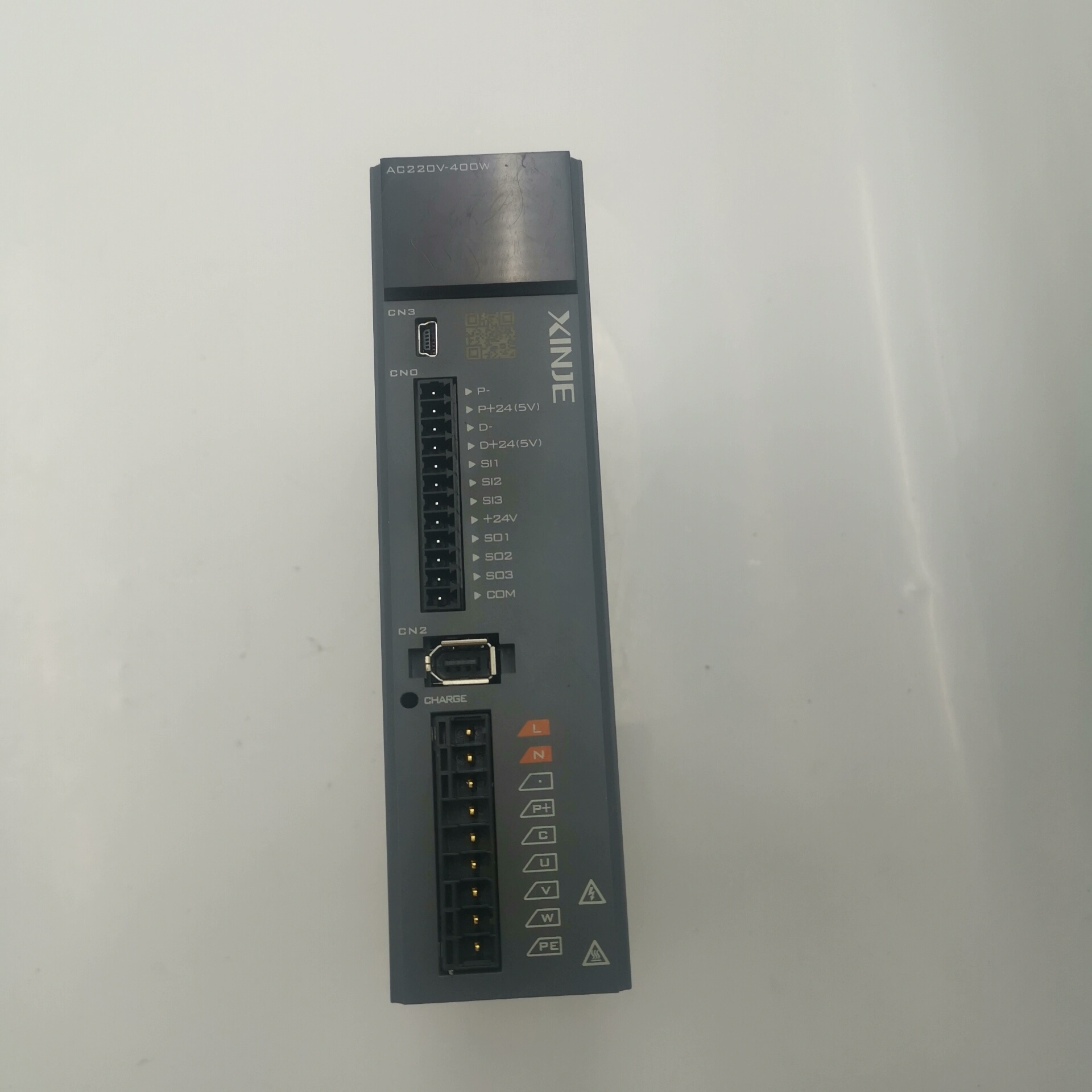 该驱动器具备多种接线端口,包括电源输入(L/N)、电机输出(U/V/W)、编码器反馈接口以及数字信号输入/输出端子,支持多种控制模式,适应性强。外壳坚固耐用,散热良好,适合长时间连续运行。