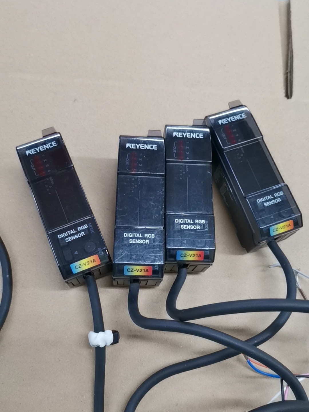 基恩士(KEYENCE)CZ-V21A是一款高性能数字RGB传感器,专为工业自动化领域的颜色检测和物体识别设计。设备采用黑色方形机身,集成显示屏和多色指示灯,可直观显示检测状态和参数,配备黑色线缆引出,末端彩色线芯便于接线,整体结构紧凑,适合安装空间有限的工业环境。