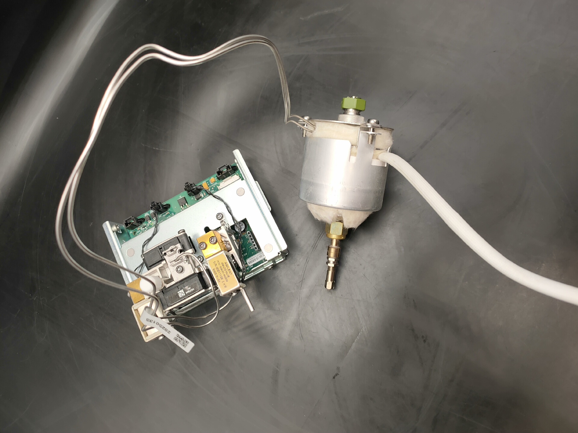 - 进样口核心部件:金属外壳封装,内置加热元件及管线接口,表面覆有白色保温层以维持稳定温度环境,适用于液体或气体样品的汽化与导入。