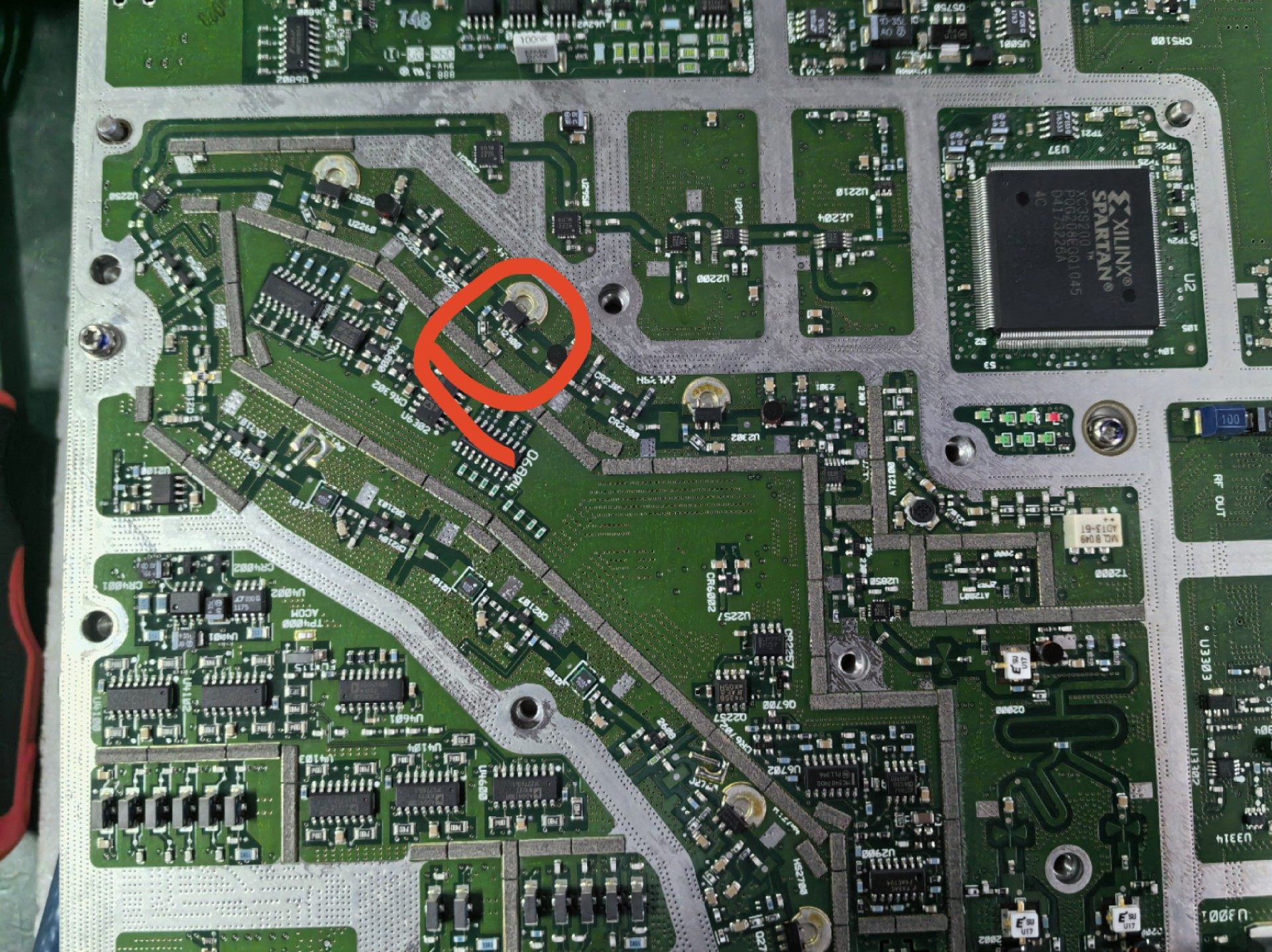 XILINX 1GC1-4298 电子元器件芯片为全新原装产品,具备高可靠性和稳定性,适用于各类工业控制与电子设备中。电路板采用绿色基板设计,集成多种精密电子元件,红色圆圈标记区域为放大器模块,支持通过电压法和阻值法进行故障检测与维护。