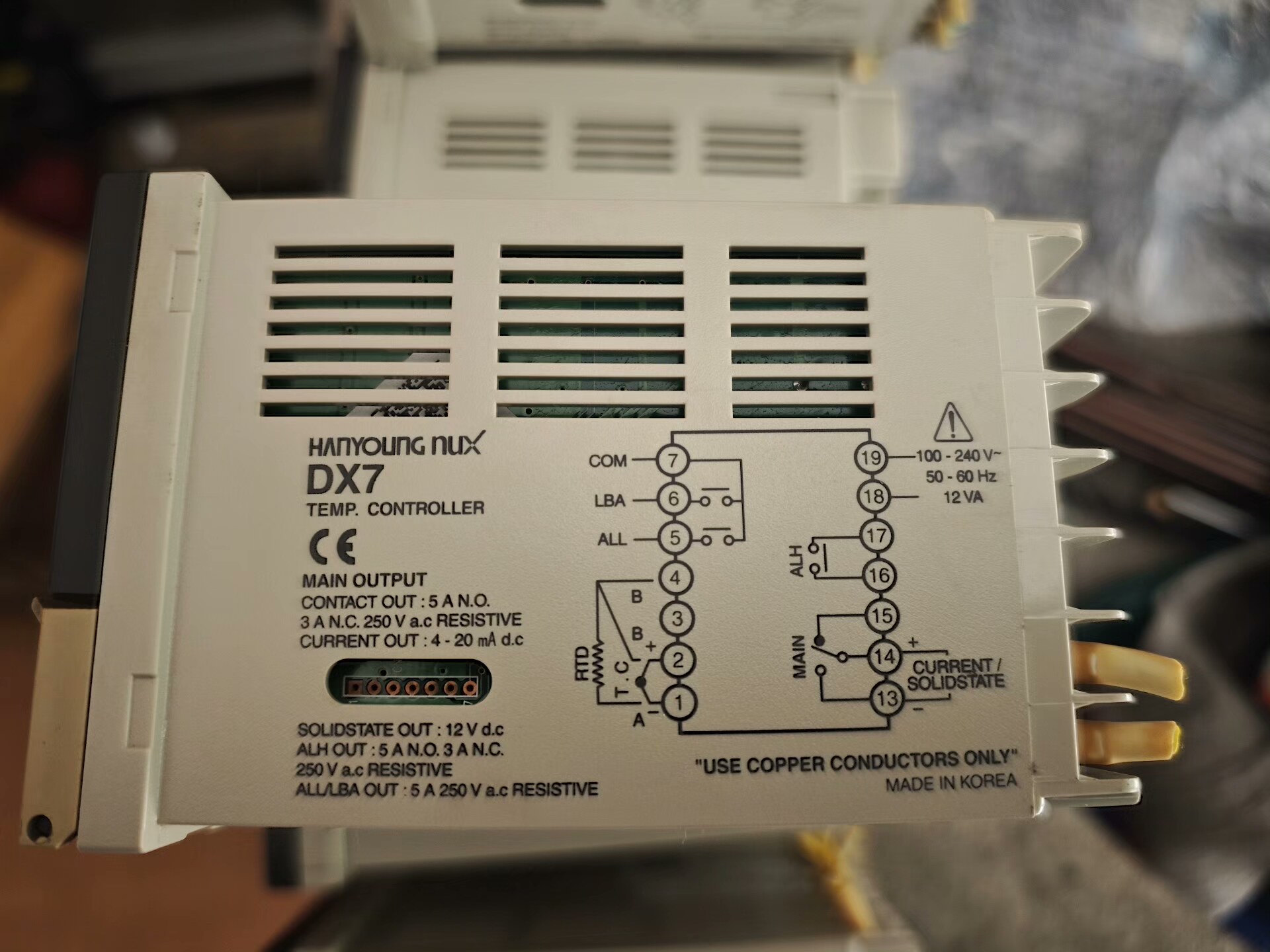 HANYOUNG NUX DX7 温度控制器采用黑色面板设计,配备双行四位数字显示,清晰展示测量值(PV)和设定值(SV)。面板上集成OUT(输出)、AT(自整定)、LBA(下限报警A)、ALH(上限报警H)、ALL(下限报警L)等指示灯,实时反馈设备运行状态。产品符合CE认证标准,具备高稳定性和可靠性,适用于各类工业温度控制场景。