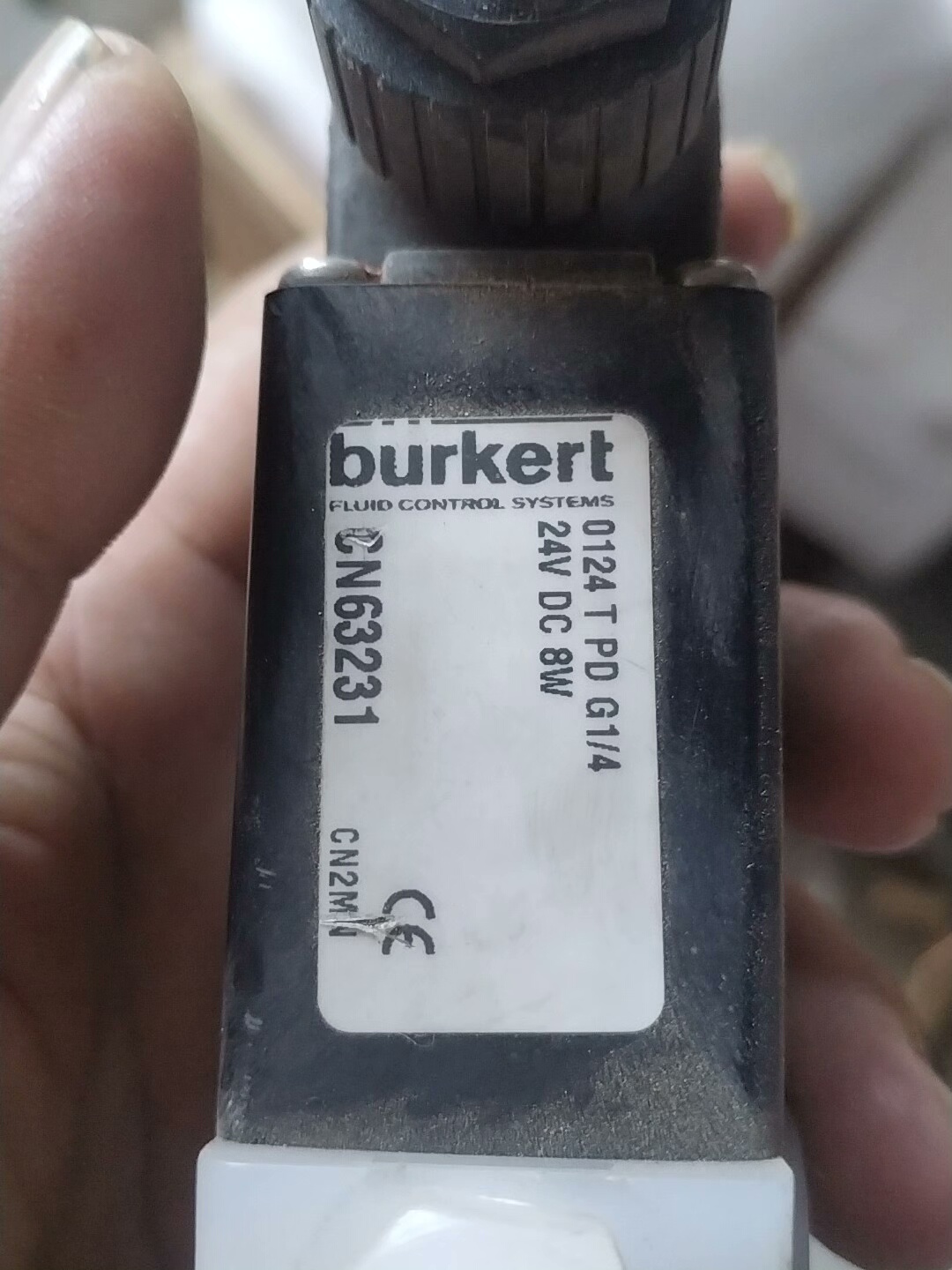 本产品为拆机的Burkert(宝德)电磁阀,型号528231,是一款用于流体控制的气动液压元件。设备整体为黑色外壳,底部设有白色接口,顶部连接电缆,外观存在正常使用痕迹,功能完好,适合工业自动化系统中的流体通断控制场景。