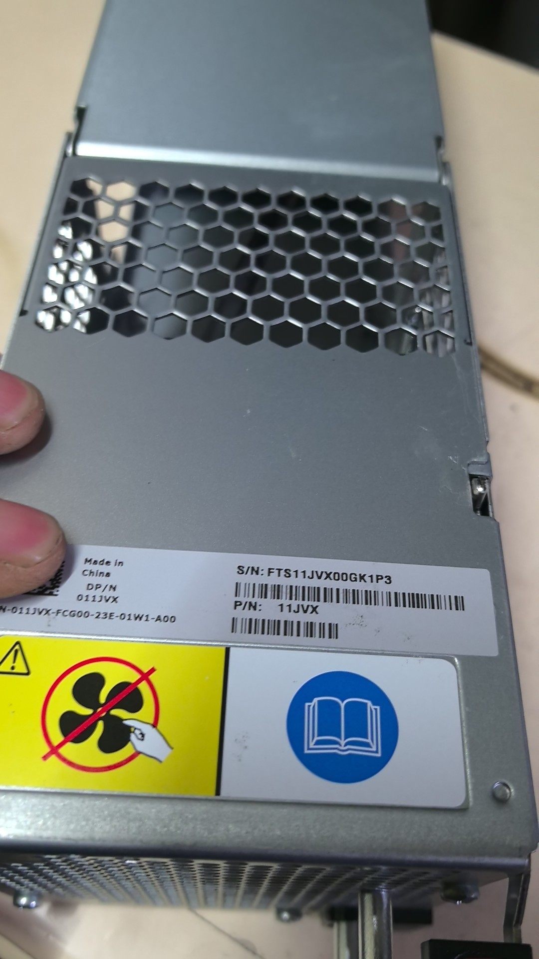 - 安全警示标识:侧面贴有黄色警告标签,明确标注“禁止遮挡风扇”图标,提醒用户保持散热通道畅通;蓝色书本图标提示需查阅产品手册以获取详细安装和维护说明。