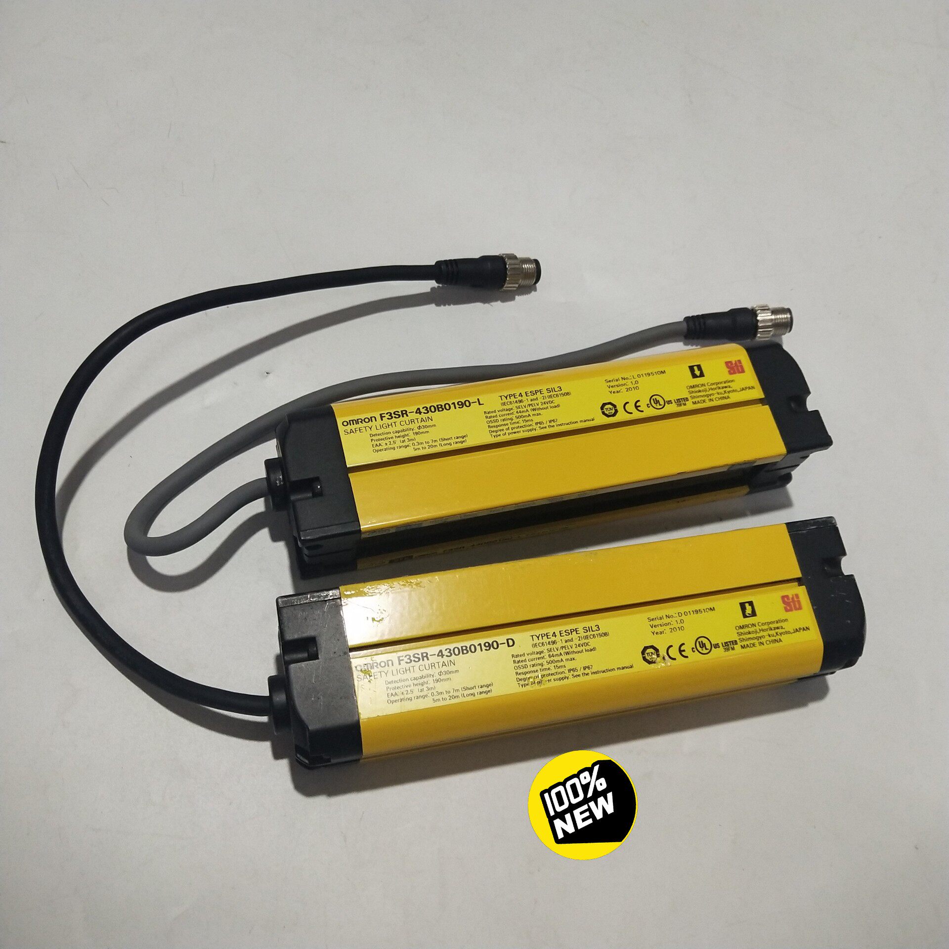 OMRON欧姆龙F3SR-430B0190-D/L安全光栅传感器为原装正品拆机产品,实物实图拍摄,库存现货供应。产品采用黄黑相间的警示色外壳,结构紧凑,包含发射器(L型)与接收器(D型)两部分,配备多芯线缆接口,便于安装与连接。具备高可靠性的光电检测功能,可有效实现工业自动化场景中的安全防护。
