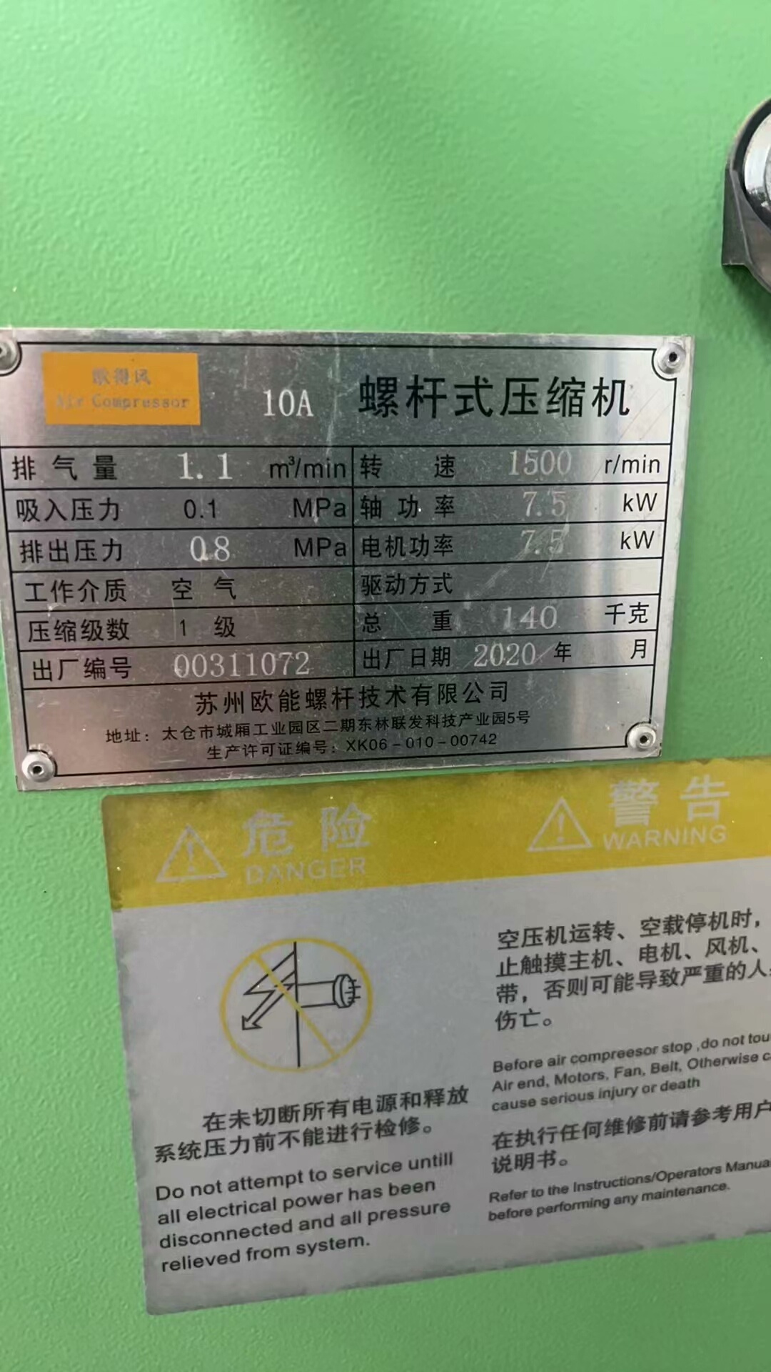 本产品为伟杰机电生产的10A型号永磁变频螺杆空压机,搭配立式储气罐组成两件套,整体成色达9成新,性能稳定,适用于多种工业场景。