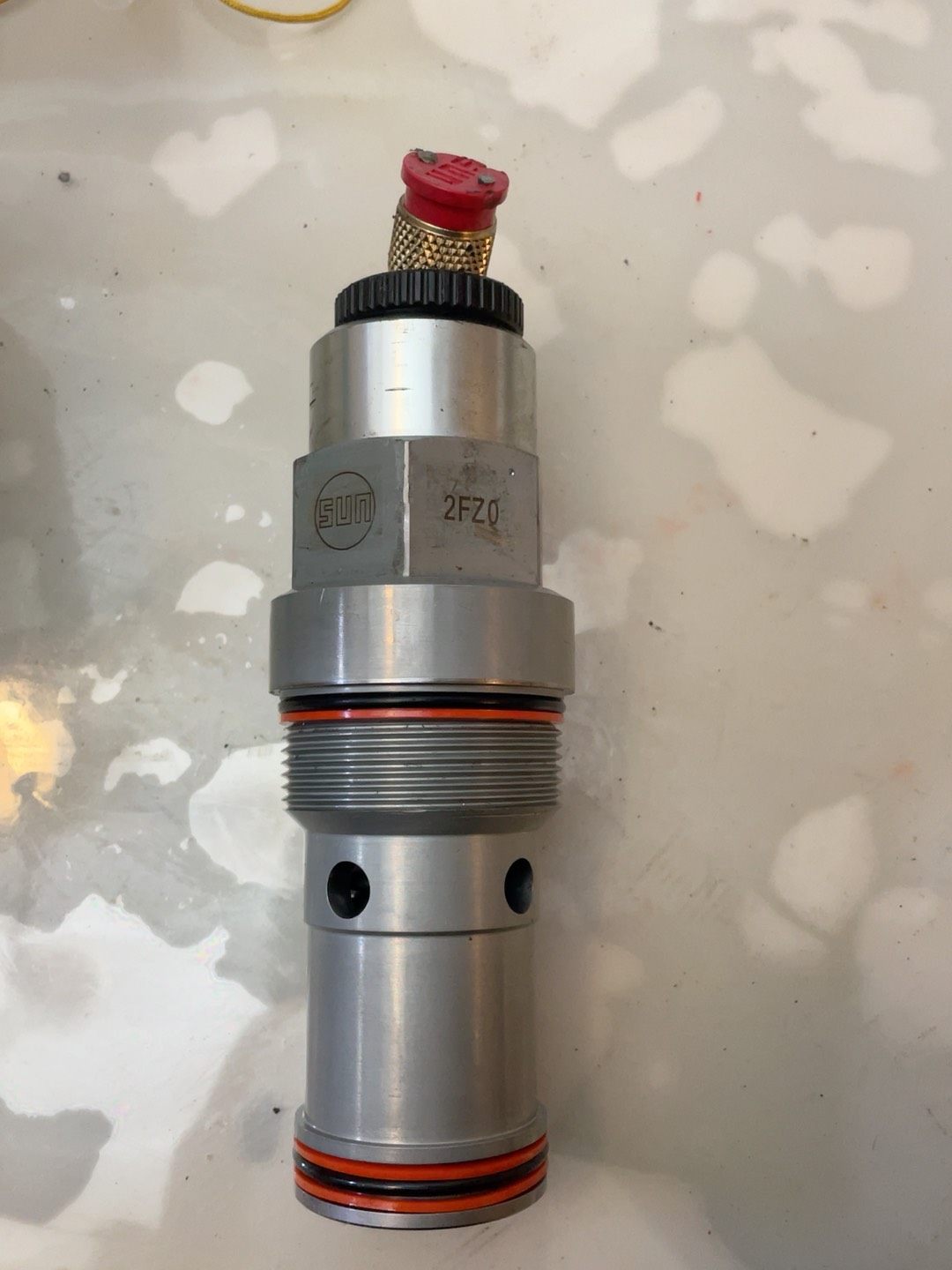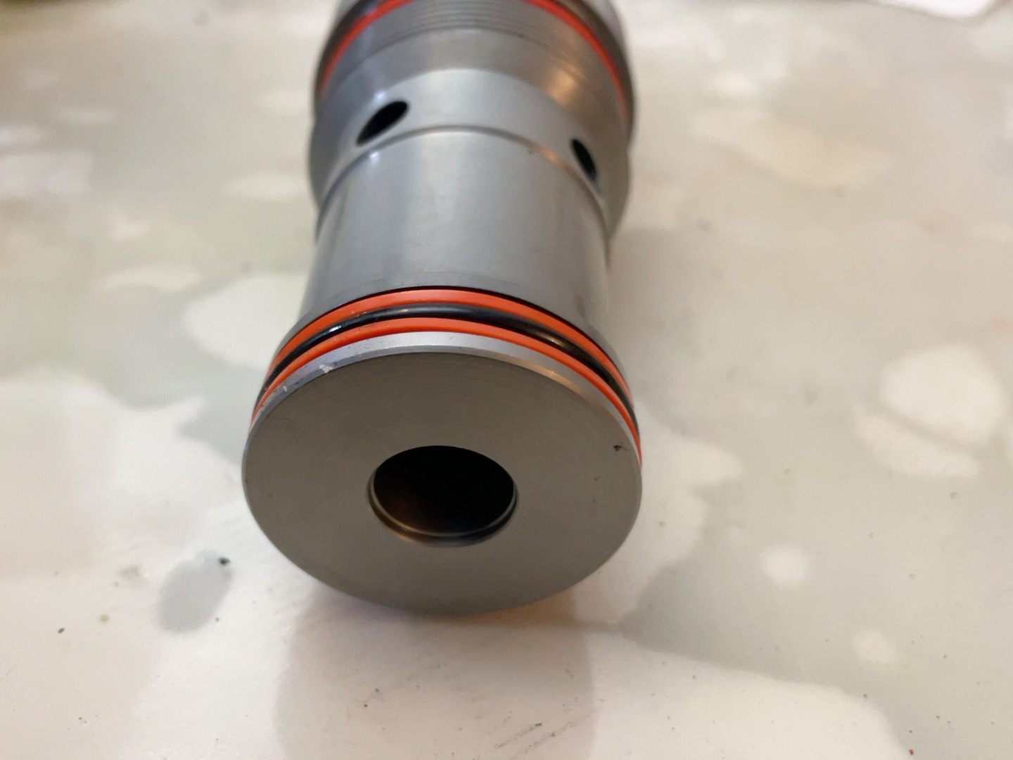 产品整体呈银色金属质感,圆柱形结构,中部设有六角形扳手接口,方便安装与调节;外部加工有精密螺纹,可与液压块紧密连接;橙色密封圈位于螺纹下方,起到密封作用;底部对称分布两个通孔,用于流体流通。