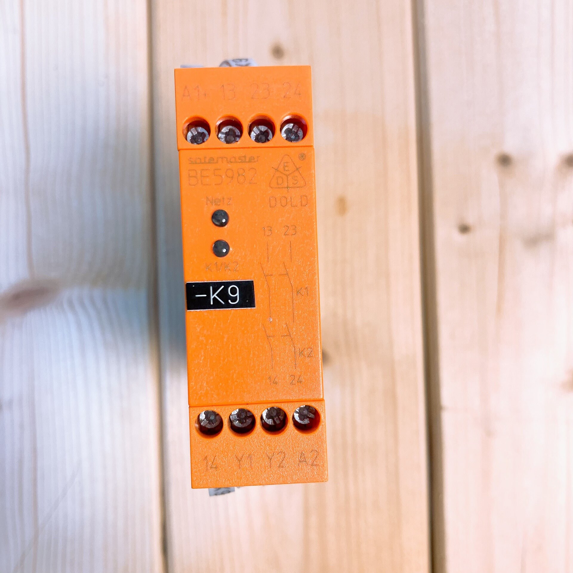 德国DOLD多德 BE5982 安全继电器是一款原装正品拆机设备,成色接近全新,适用于工业自动化领域的安全控制场景。其独特的橙色顶部与黑色主体设计,搭配蓝色接线端子,整体结构紧凑,安装便捷。