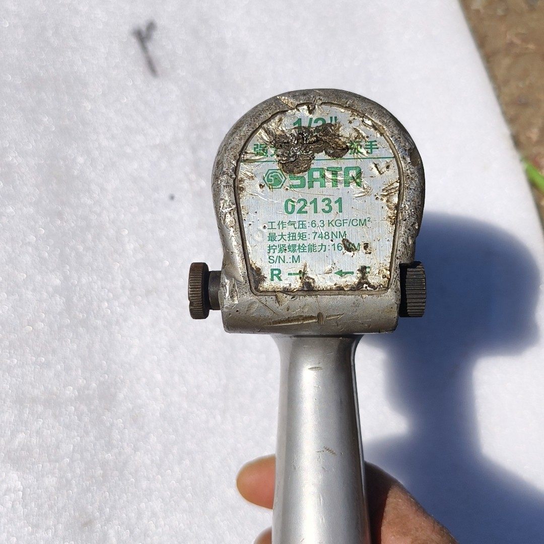 本产品为SATA世达品牌的02131型号气动冲击扳手,采用银色金属机身设计,黑色冲击头,结构坚固耐用。机身表面虽有使用痕迹(如锈迹、划痕),但核心功能部件完好,适合工业级高强度作业需求。手柄处清晰印有“SATA”品牌标识,底部标注“OIL DAILY!”,提醒用户需每日进行加油保养,以确保工具长期稳定运行。