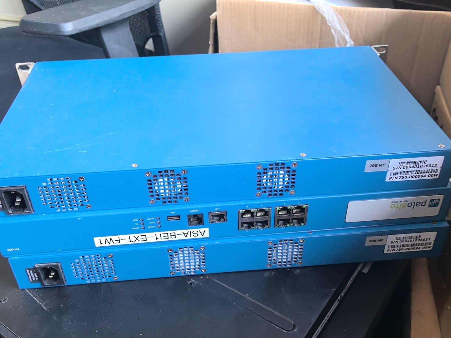 Palo Alto PA-500是一款专为企业网络安全设计的高性能千兆防火墙设备,采用蓝色金属机身,结构紧凑且坚固耐用。设备正面配备多个千兆以太网接口及状态指示灯,标签标识为“ASIA-SHE1-EXT-FW1”,显示其曾用于特定网络环境的边界防护。该防火墙集成了先进的安全功能,能够有效保障企业网络的稳定运行与数据安全。