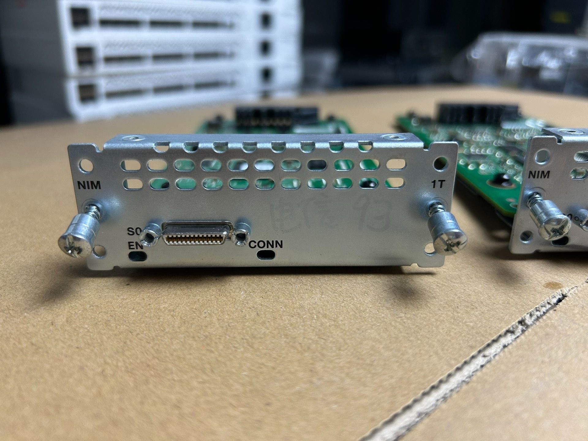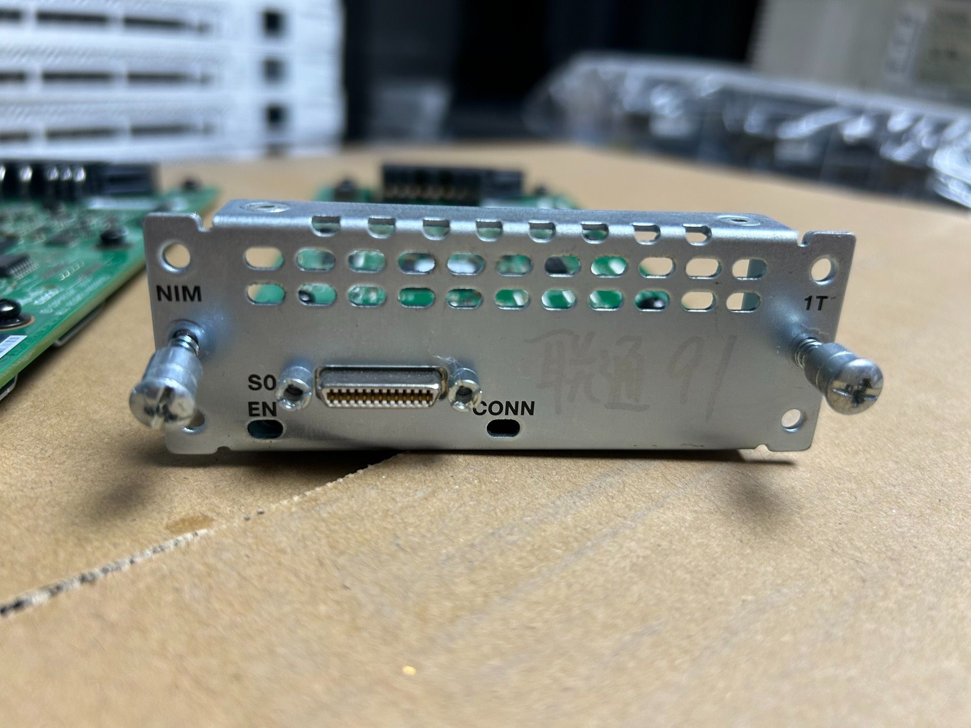 思科Cisco NIM-1T是一款拆机路由器模块,专为思科ISR系列路由器设计,提供可靠的网络接口扩展功能。该模块采用绿色电路板结构,搭配金属接口面板,集成D型连接器等接口,适用于企业网络环境中路由器的功能升级与扩展。