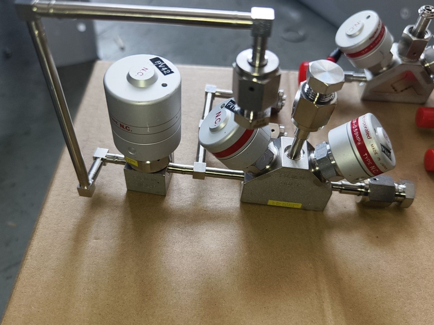 本产品为AMAT 0050-21148与0050-25197型号的富士金隔膜阀组件,共两套。采用银色金属材质,结构紧凑,包含多个功能阀体,部分阀体标有FV15、FV42等型号标识,控制单元为白色圆形设计,带有红色调节旋钮,整体设计符合工业流体控制的高精度要求。阀体标注N.C.(常闭)状态,确保非工作状态下的流体截止安全性。