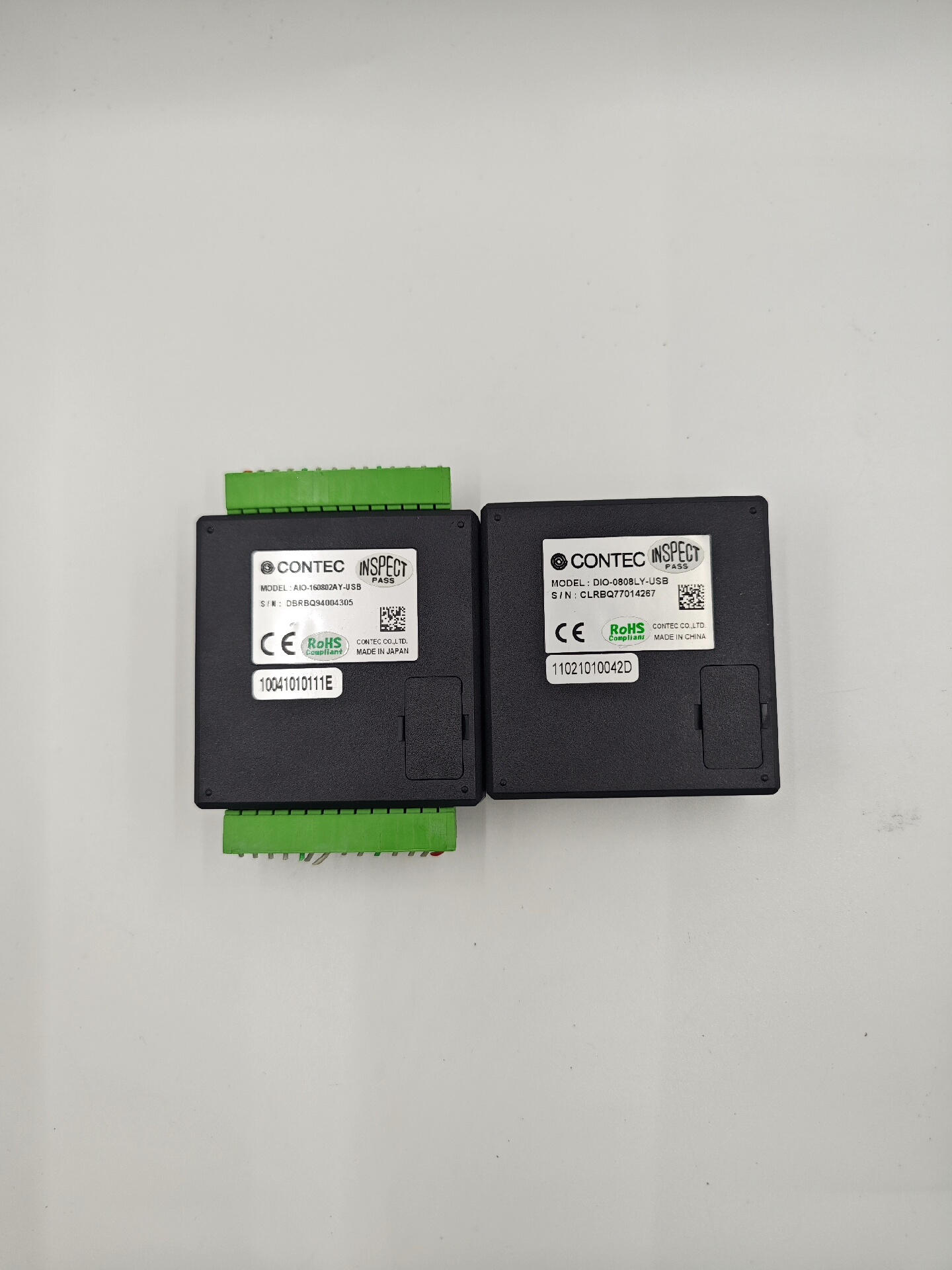 本产品为日本CONTEC品牌的USB I/O终端,包含AIO-160802AY-USB和DIO-0808LY-USB两种型号,成色8-9成新,功能正常,部分设备带有标签贴纸但不影响使用。设备采用黑色外壳搭配绿色端子排,设计紧凑,通过USB接口与计算机连接,适用于工业自动化领域的信号采集与控制。