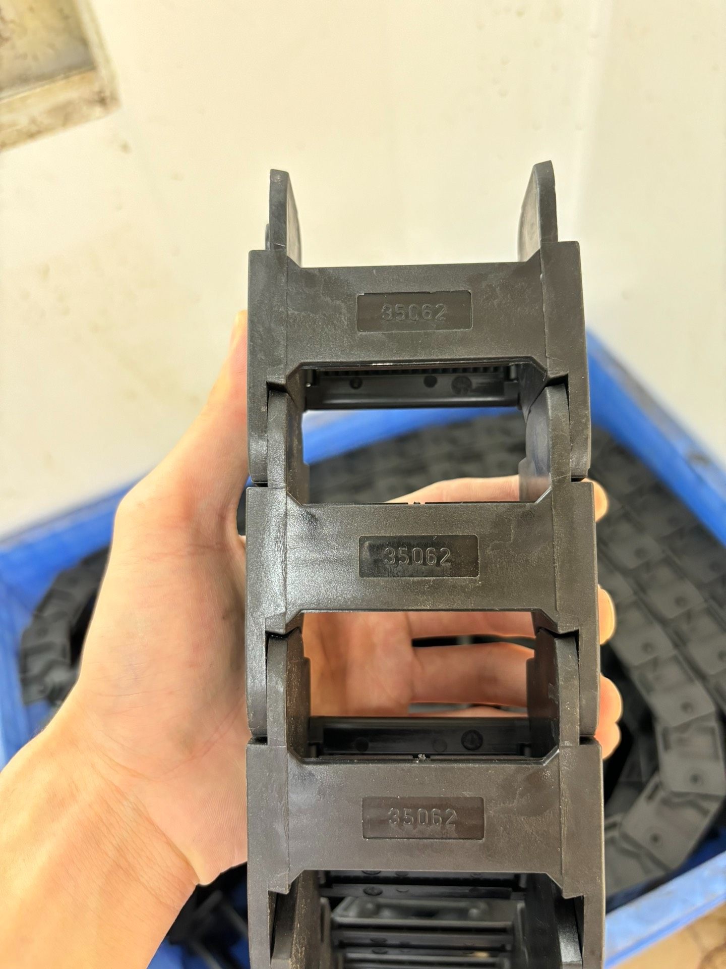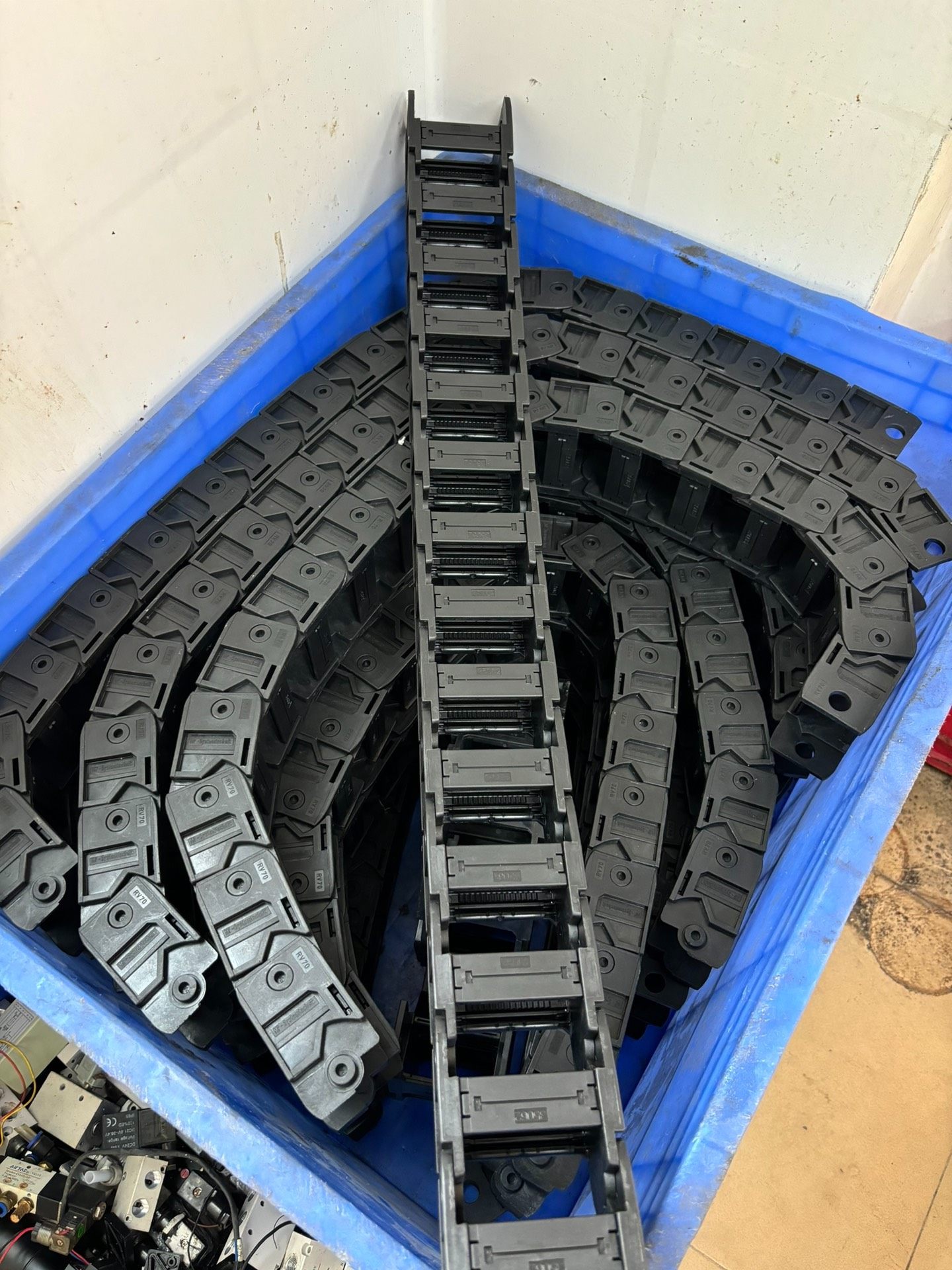 本产品为全新未使用的塑料拖链(坦克链),型号为RY70,采用优质黑色塑料材质制成,链节式结构设计,具备良好的柔韧性和耐磨性。单条长度为1米,整体呈环形堆叠状态,外观整洁无破损,确保在使用过程中能有效保护内部线缆免受外部环境的摩擦、拉扯等损伤。