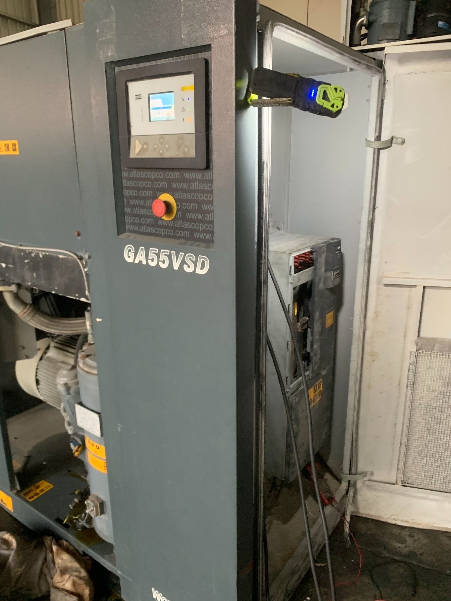 阿特拉斯工业空压机是一款集成化压缩空气解决方案,采用蓝色防护外壳设计,内部包含先进的控制面板、高性能变频器、储气瓶及精密管路系统。该设备专为工业生产场景打造,具备稳定供气、高效节能等特点,广泛应用于制造业、自动化生产线、气动工具驱动等领域。