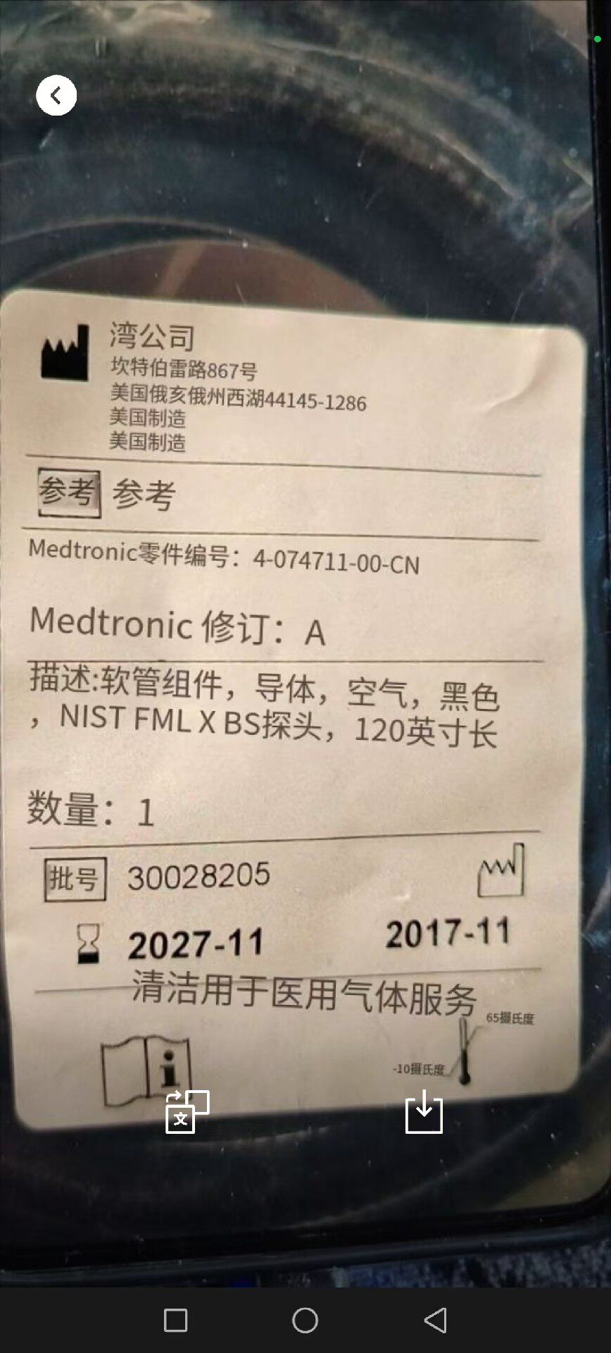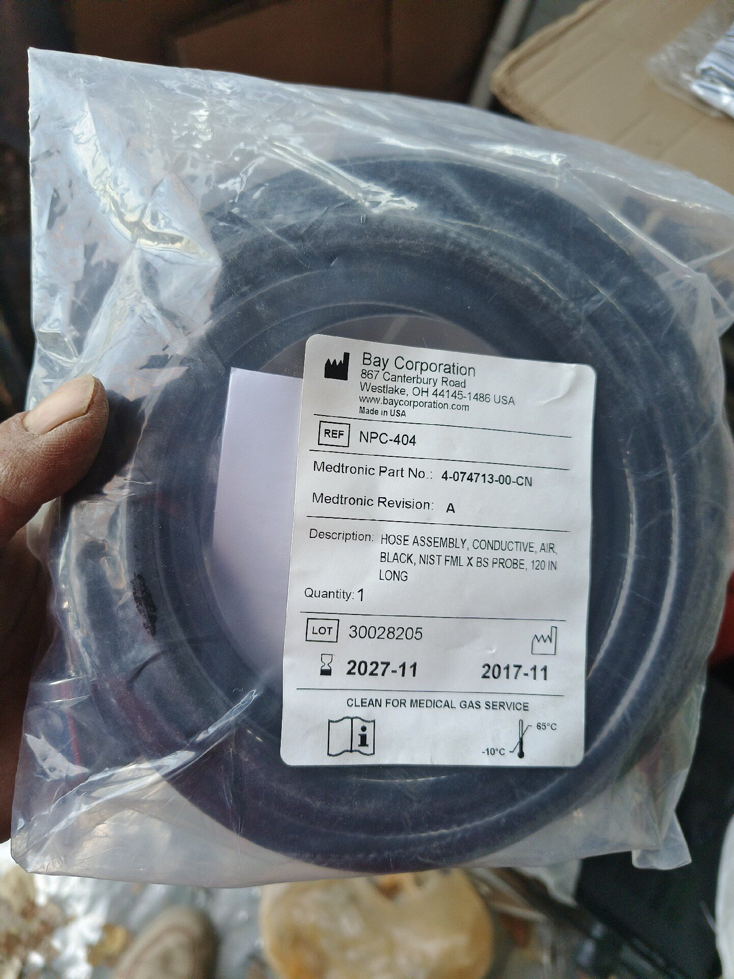 本产品为美国进口原装全新未使用的低压医用气体软管套头,品牌为Bay Corporation,型号11-205711。软管主体为黑色,两端配备金属接头,结构坚固耐用,确保气体输送的稳定性和安全性。包装内含《A Care and Preventive Maintenance Safety Guide for Low-Pressure Hose Assemblies for use with Medical Gases》安全维护指南,提供专业的使用和维护建议。