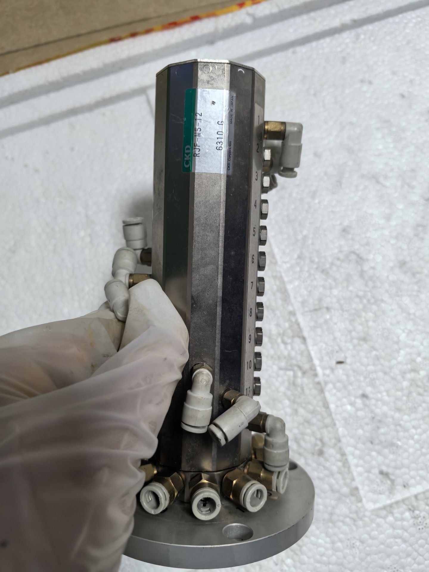 本产品为CKD品牌旗下的RJF-M5-12型号快速旋转接头,规格代码6310G,属于二手拆机件,成色如图所示。该旋转接头采用金属材质打造,整体呈圆柱形结构,表面集成多个白色快插接头与金色接口,底部配备法兰盘设计,便于稳定安装,适用于工业自动化领域中需要实现旋转与固定部件间流体传输的场景。