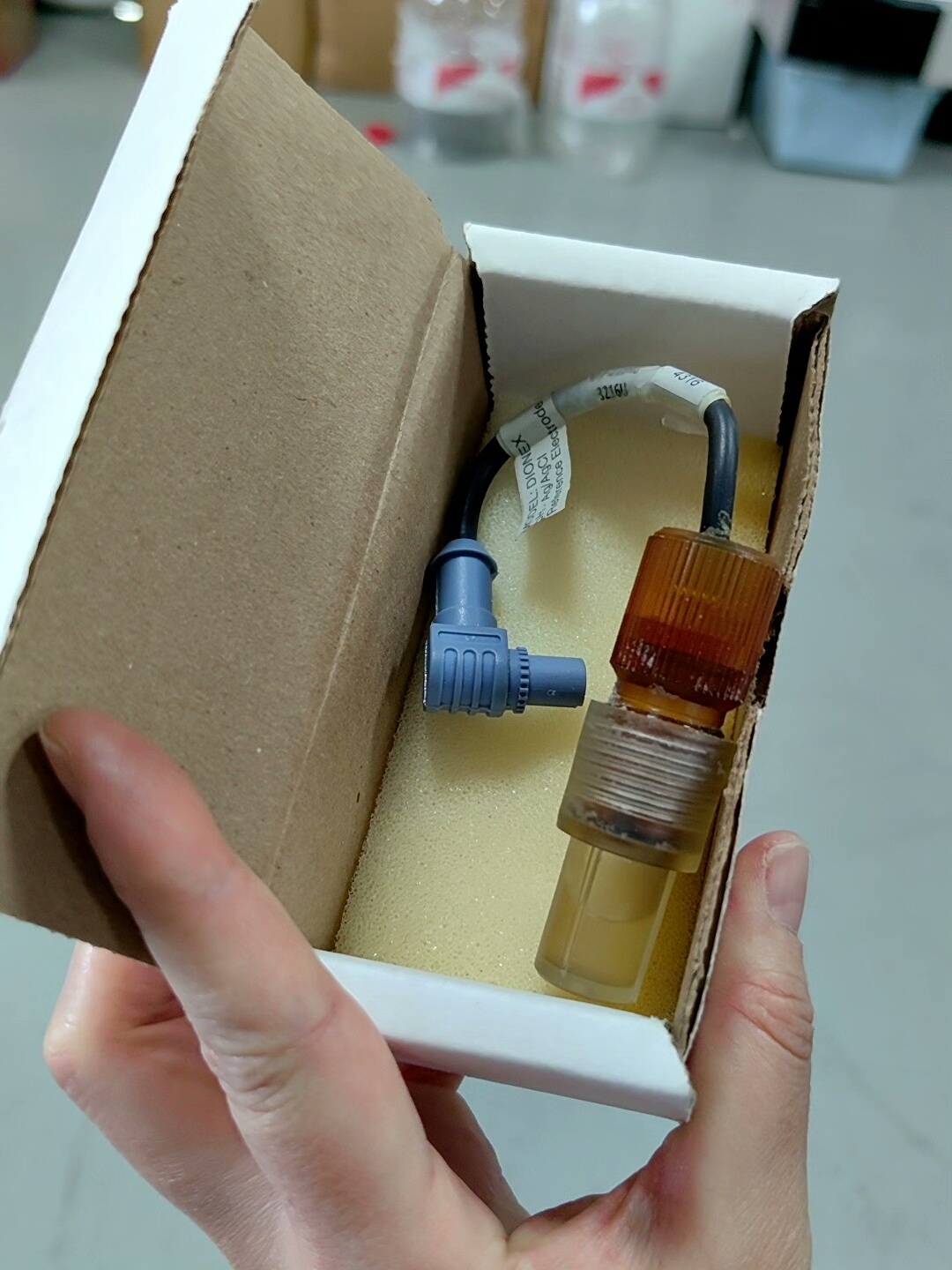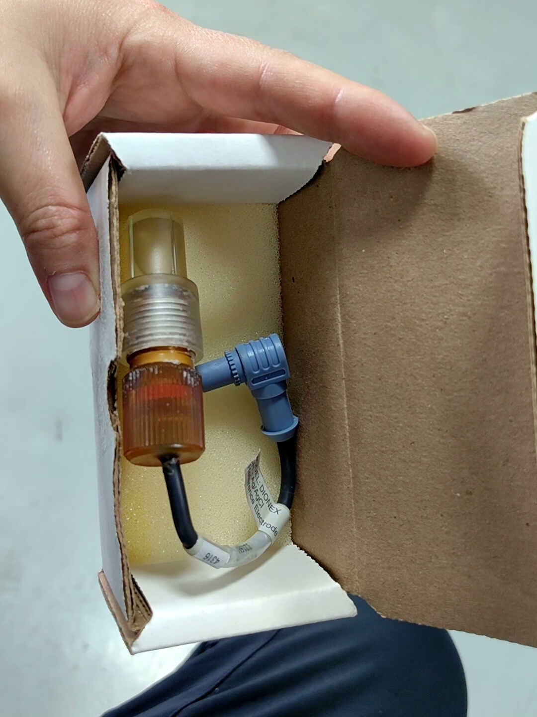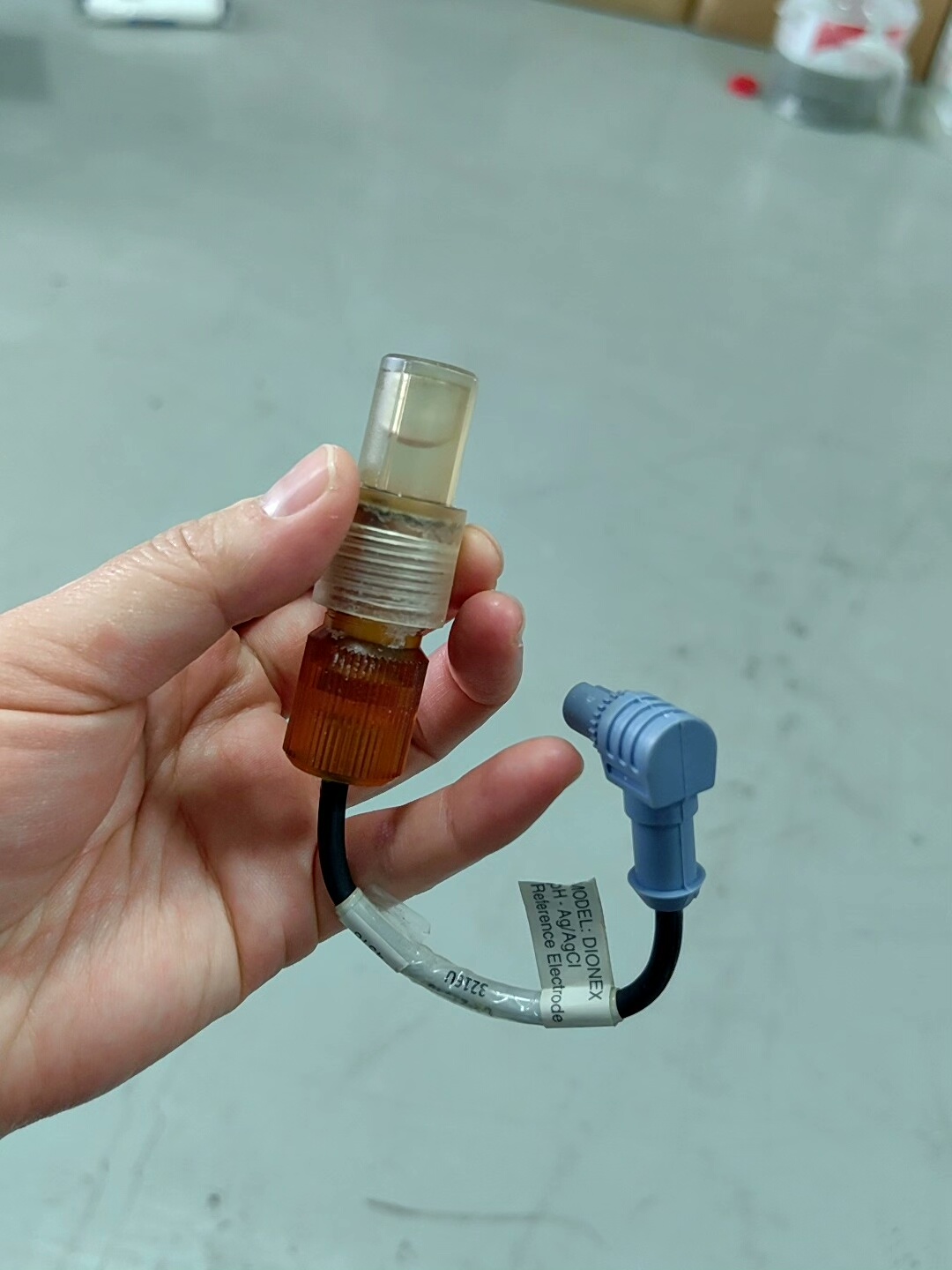 本产品为赛默飞戴安(Thermo Dionex)旗下型号061879的Ag/AgCl电极,实物拍摄,成色如图所示。产品整体结构包括透明顶部、金属螺纹接口、棕色下部及蓝色连接器,带有清晰标签标识,确保产品 authenticity。
