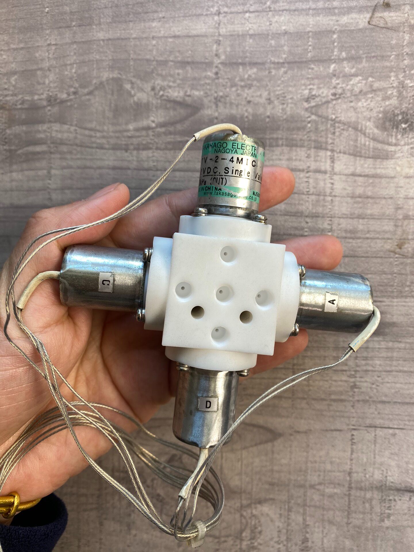 本产品为TAKASAGO ELECTRIC品牌的V-2-4M1C型号四元低压比例阀,适用于精密流体控制场景。产品采用白色塑料阀体与金属接口设计,结构紧凑,标有A、C、D接口标识,便于安装与管路连接。