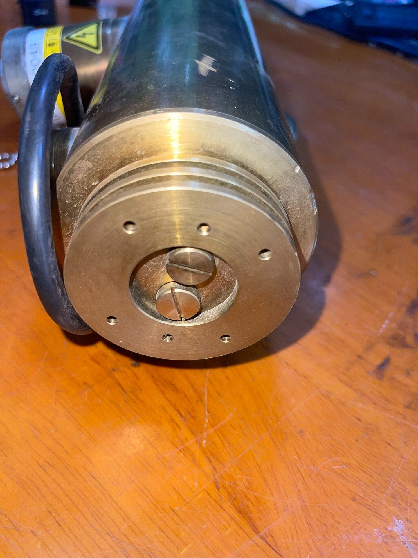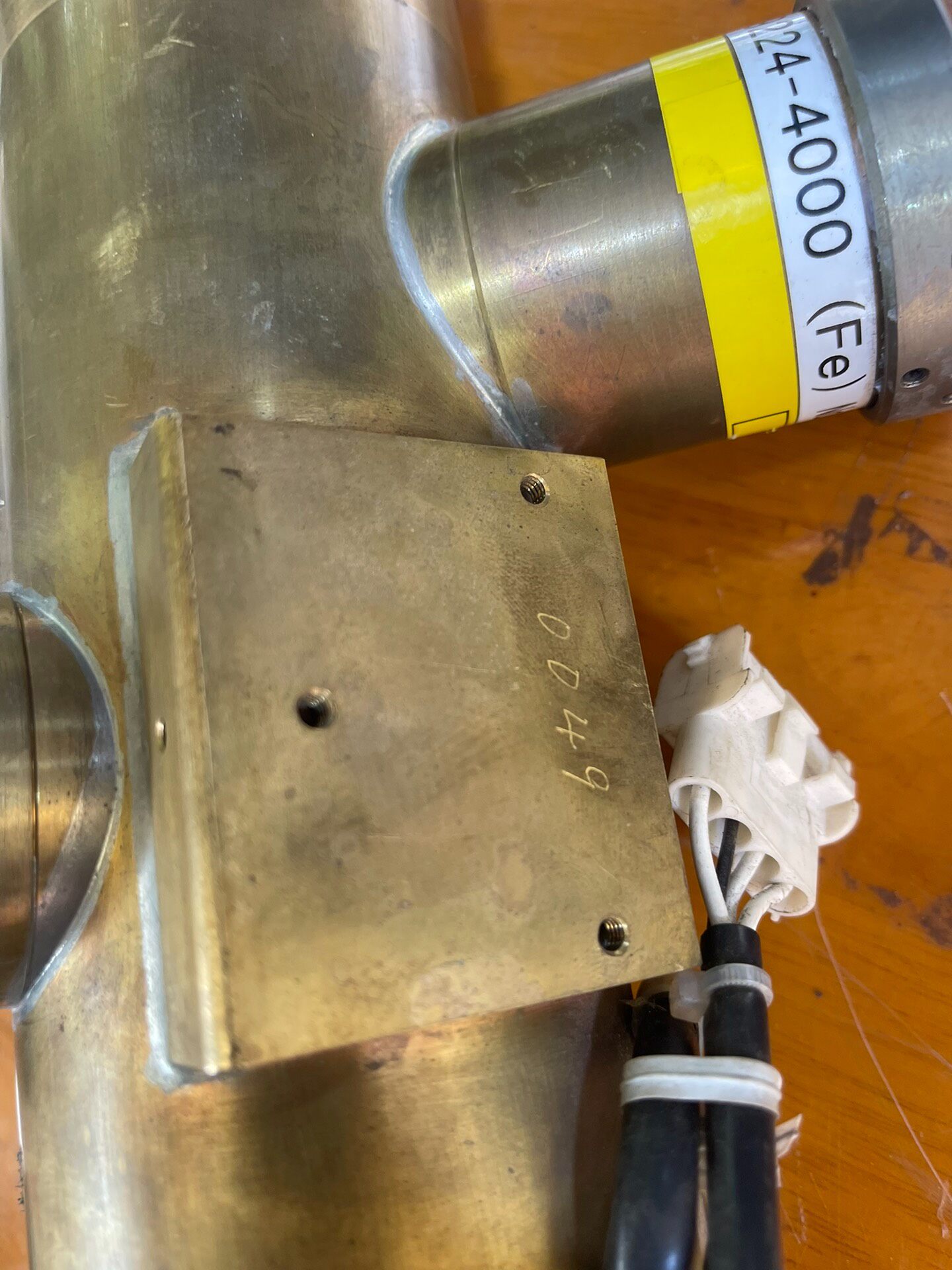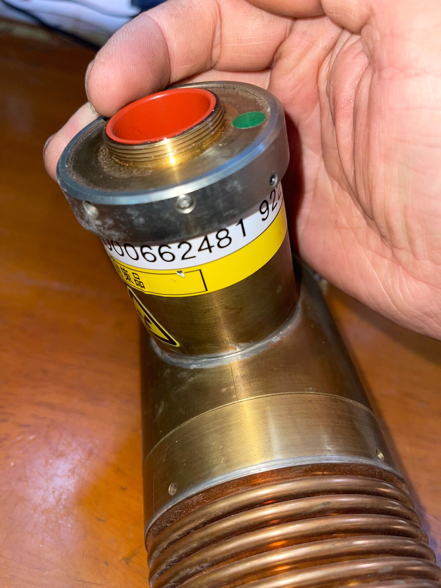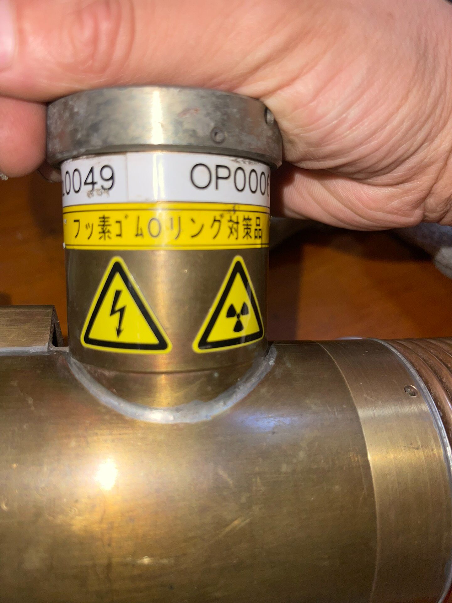 本产品为一款日本产精密设备光源,型号为OP000662481及9224-4000(Fe),属于库存货品。其主体采用黄铜色金属外壳,表面带有自然氧化痕迹,结构坚固耐用,顶部设计有散热鳍片,可有效提升散热效率,确保设备在长时间运行时的稳定性。侧面集成了一个带有高压(闪电符号)和电离辐射(三叶符号)警告标识的部件,提示使用者注意安全操作规范,避免直接接触或违规拆卸。