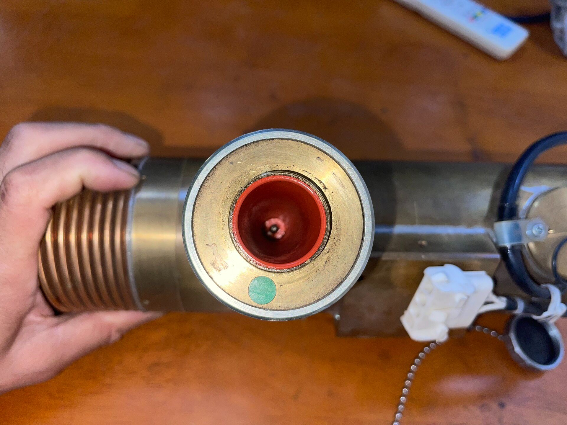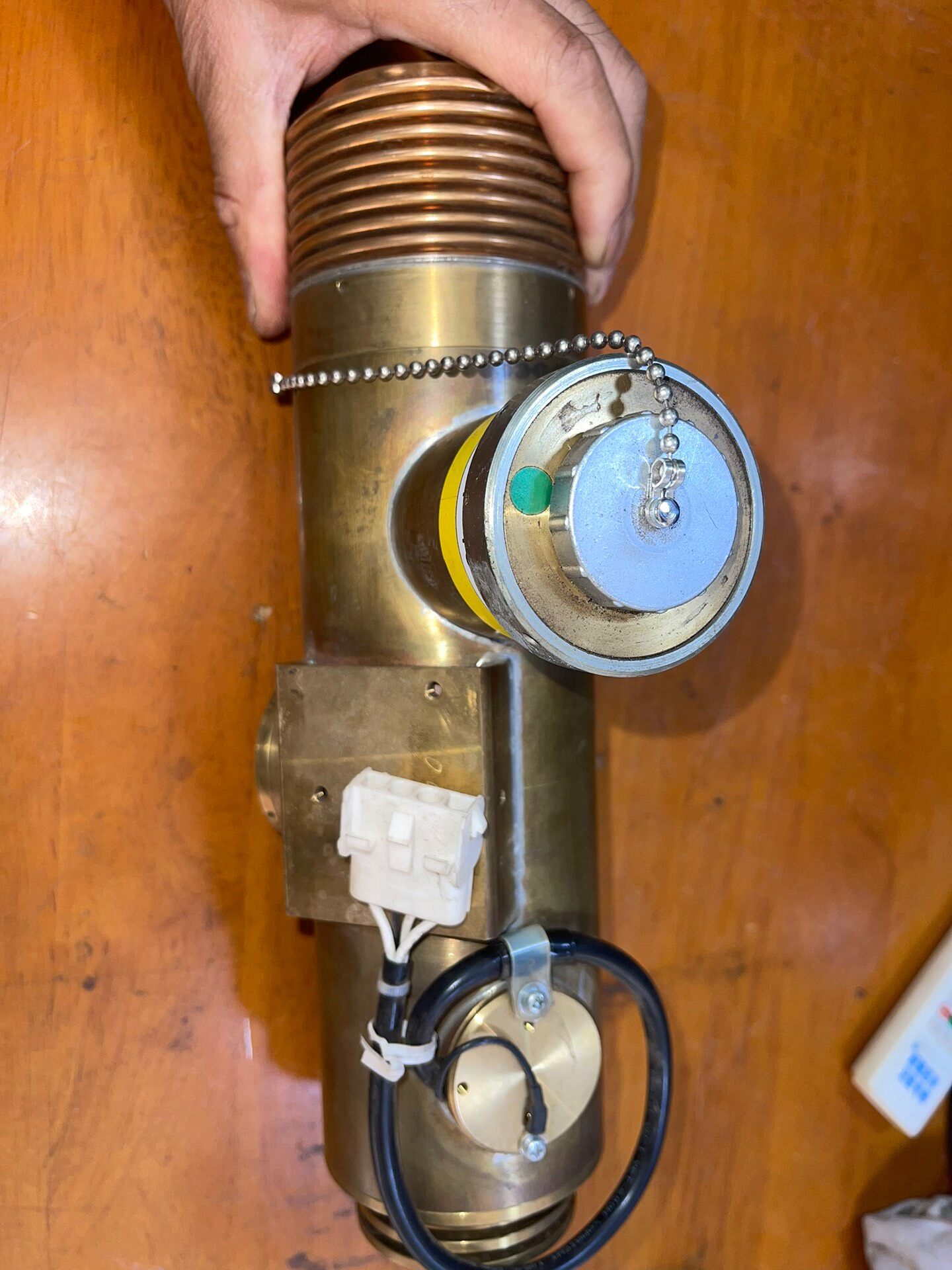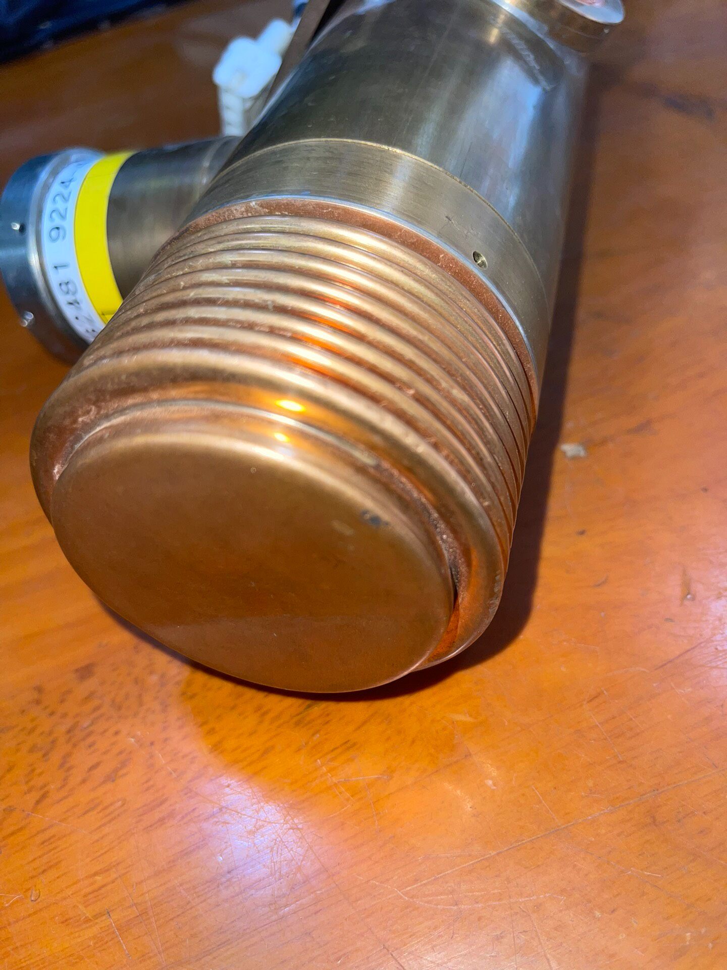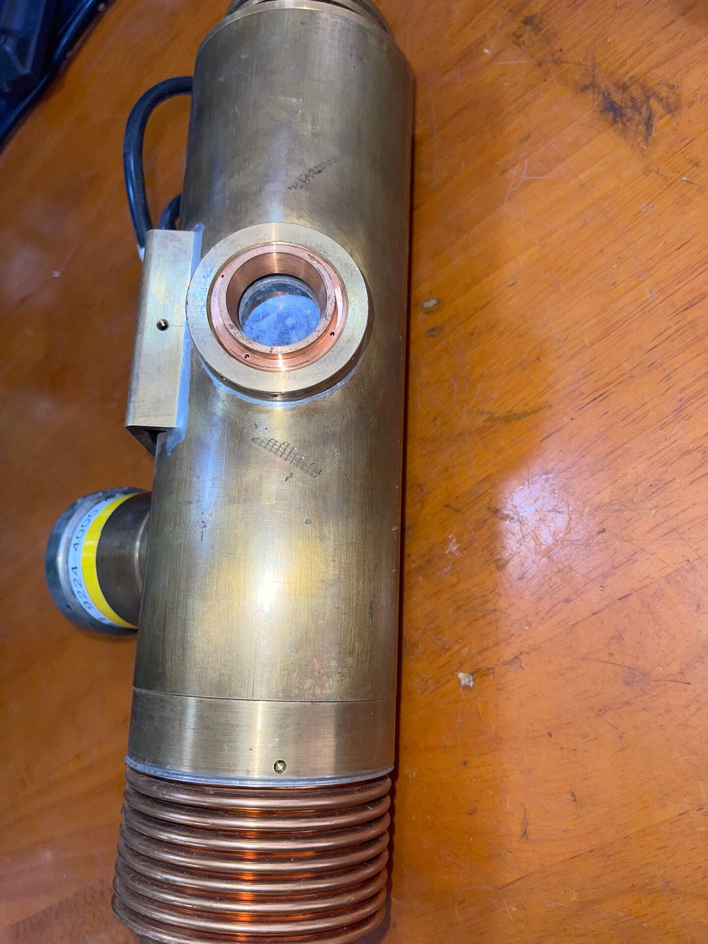 本产品为一款日本产精密设备光源,型号为OP000662481及9224-4000(Fe),属于库存货品。其主体采用黄铜色金属外壳,表面带有自然氧化痕迹,结构坚固耐用,顶部设计有散热鳍片,可有效提升散热效率,确保设备在长时间运行时的稳定性。侧面集成了一个带有高压(闪电符号)和电离辐射(三叶符号)警告标识的部件,提示使用者注意安全操作规范,避免直接接触或违规拆卸。