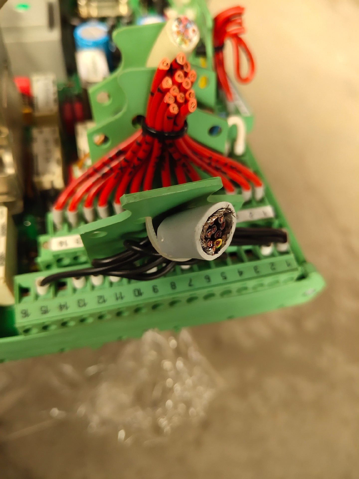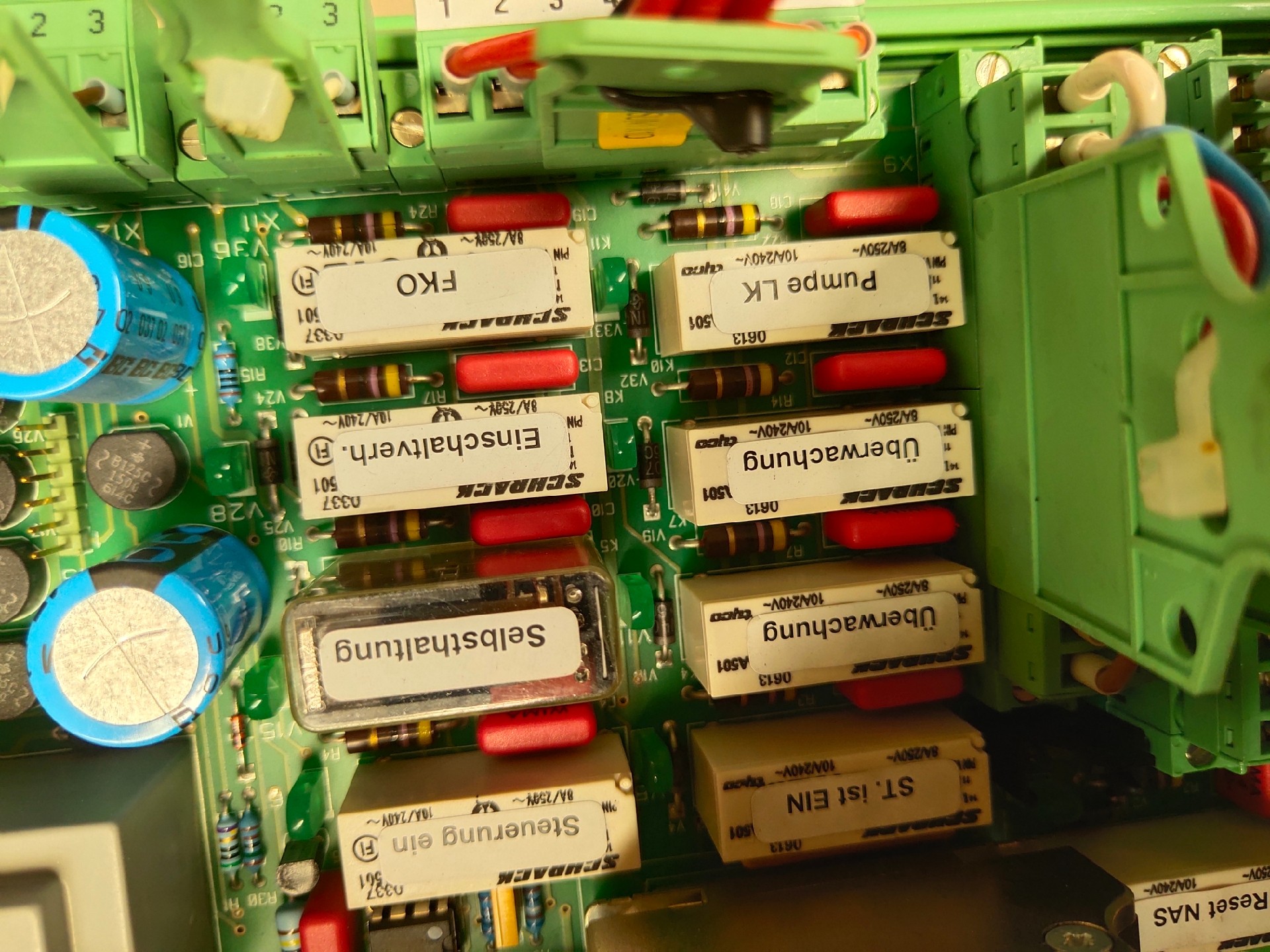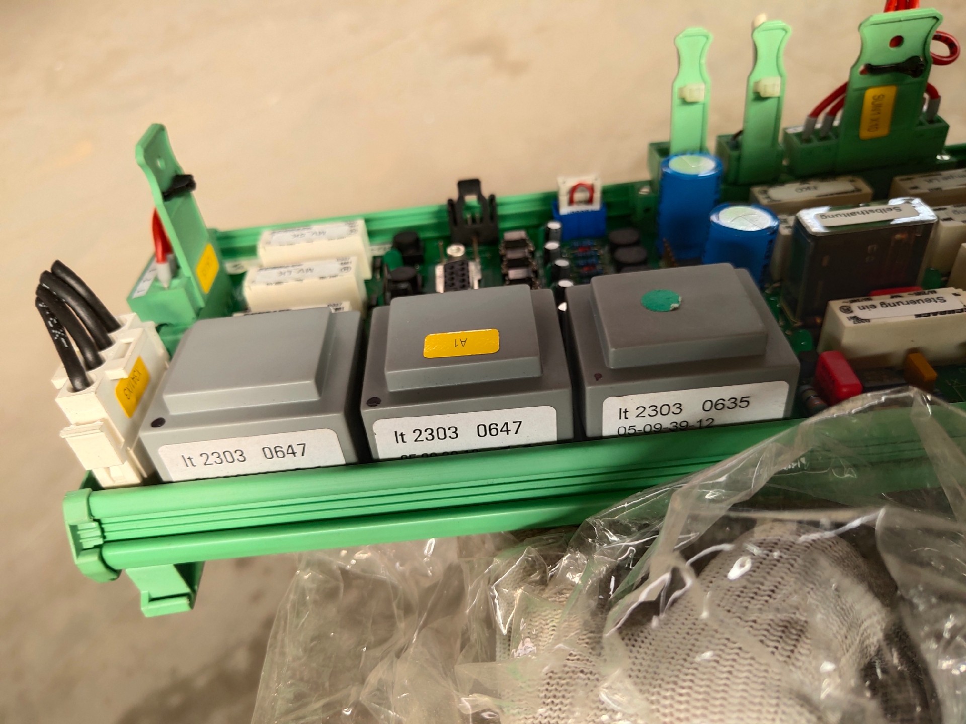 本产品为德国通快(Trumpf)激光切割机上拆机的控制板卡,实物如图所示。板卡整体呈绿色,集成了多种电子元件,包括电容、继电器、接线端子等,结构紧凑,布局合理,专为激光切割设备的控制与信号处理设计。