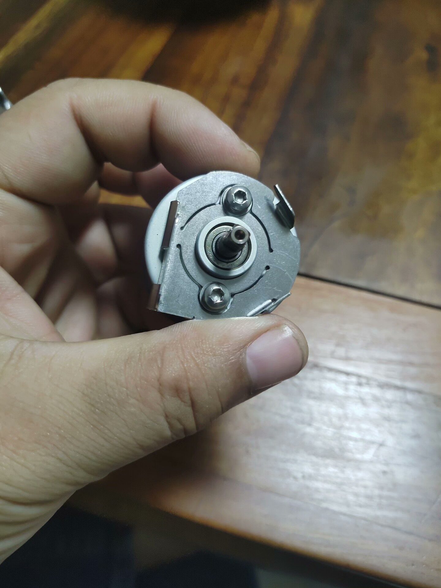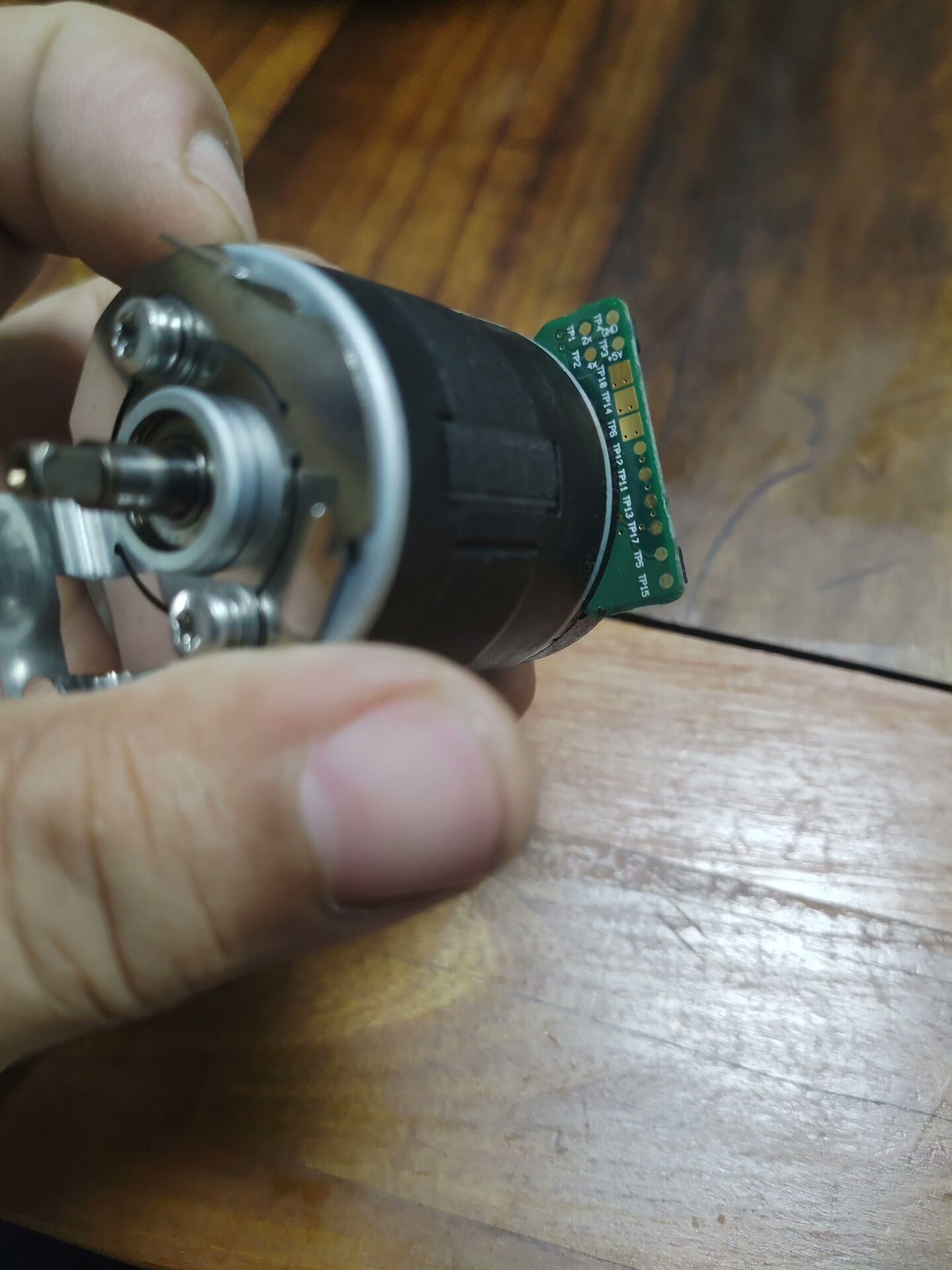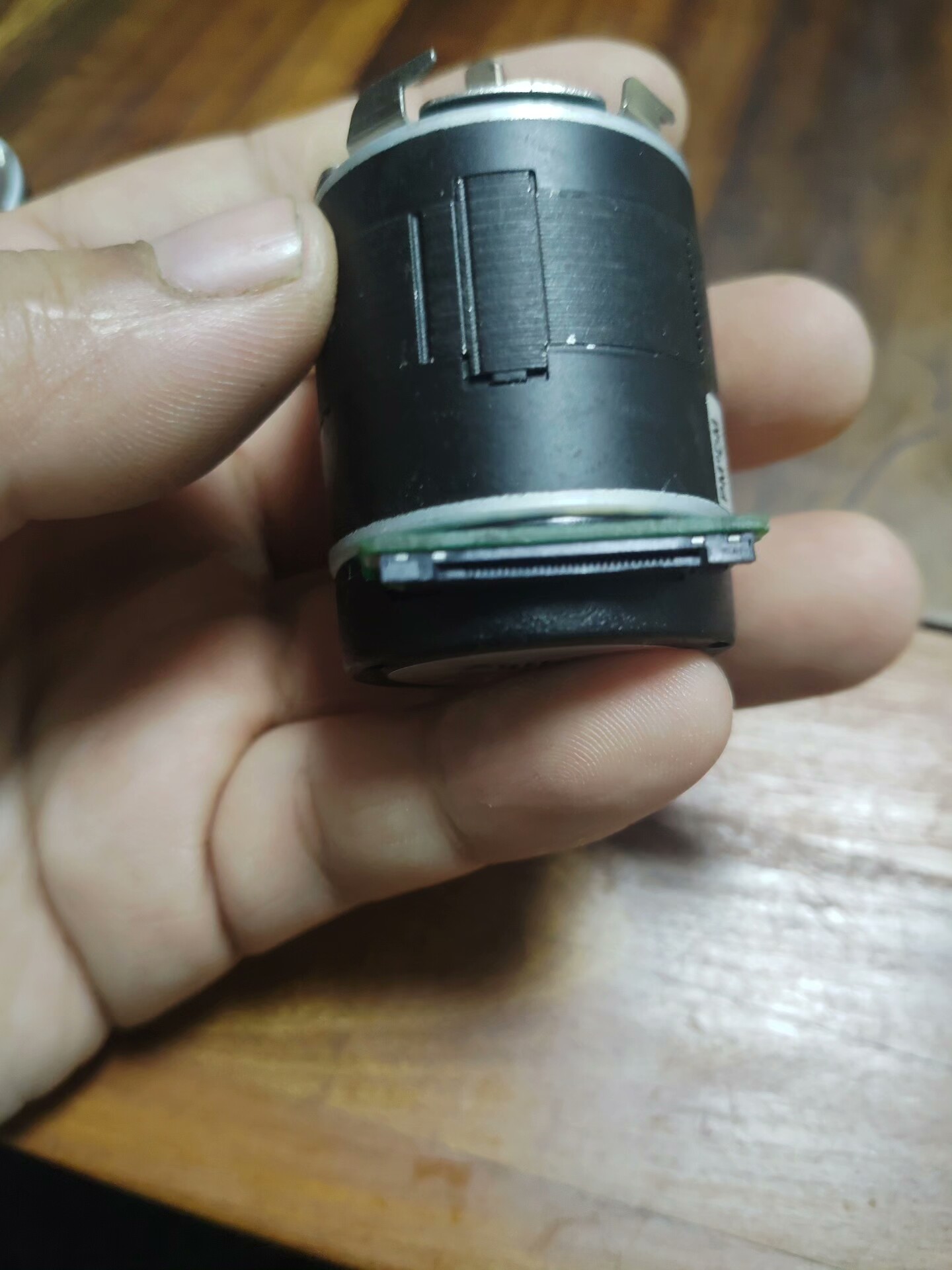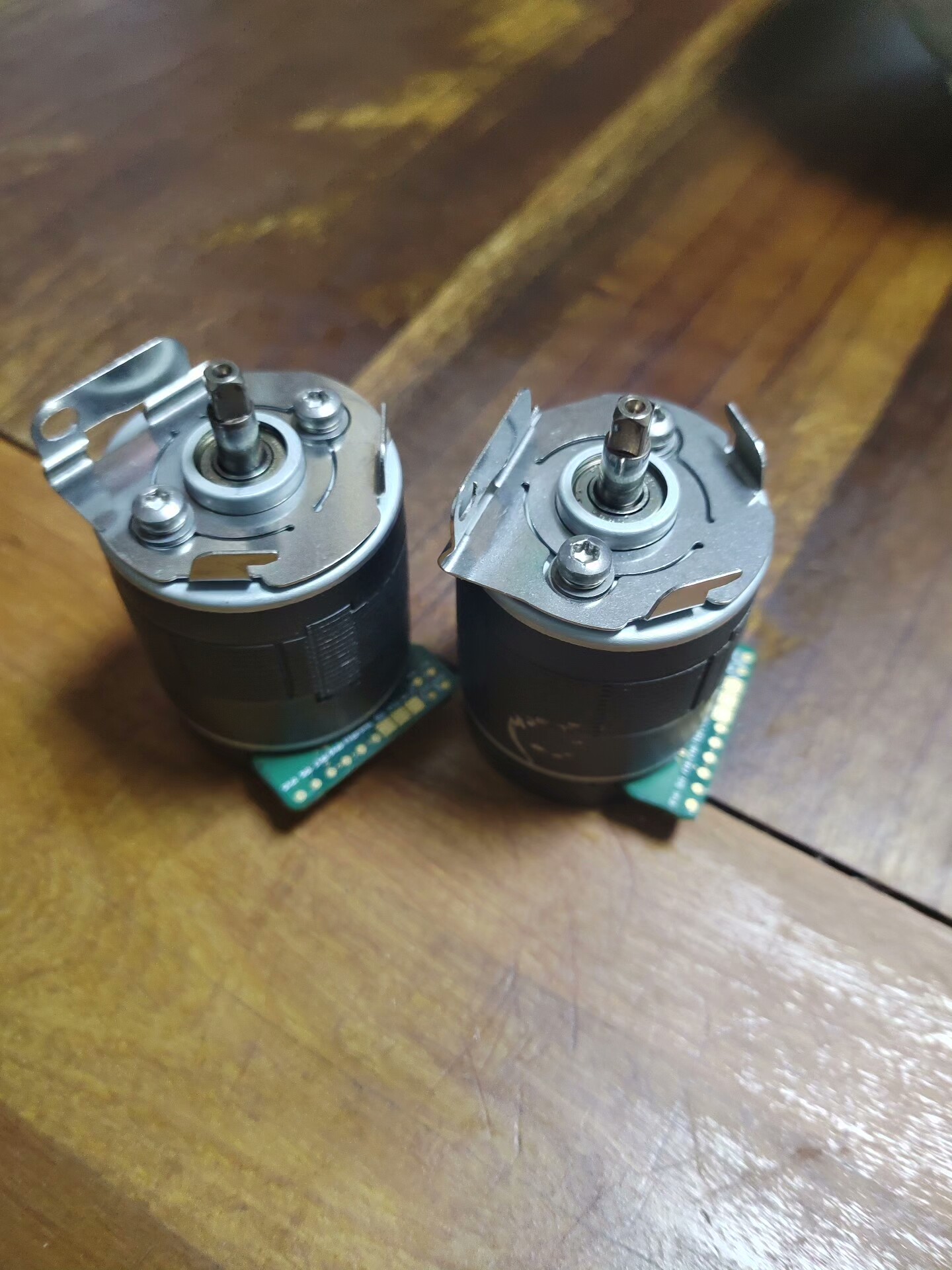 电机整体呈黑色圆柱形,直径约5-6cm,高度约8-10cm,外壳有细密纹理,标签清晰标注型号及专利信息,输出轴为金属材质,端部平整,侧面设有引脚用于电路连接,底部电路板部分露出,整体无明显破损,为拆机后测试正常的功能件。