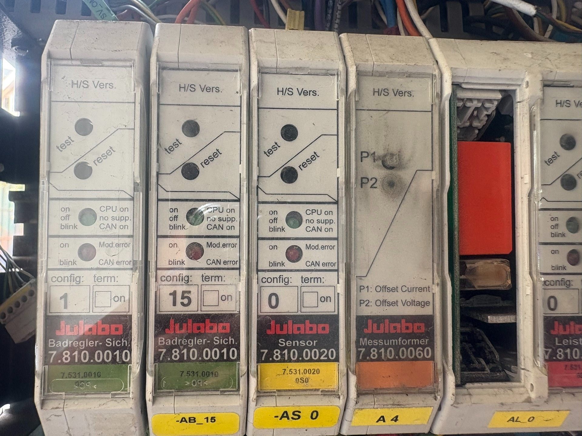 这些模块配备了多种指示灯,用于显示CPU状态、模块错误(Mod.error)以及CAN通信错误(CAN error)。此外,它们还支持不同的配置选项,例如config: term: 0/15/0/0,允许用户根据具体需求进行设置。