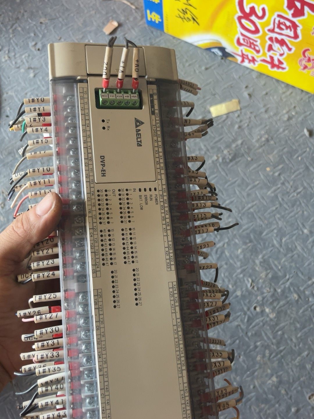 本产品为拆机台达PLC,型号DVP80EH00T3,属于台达DVP-EH系列,版本号V2.08,2017年出厂。设备功能完好,实物拍摄,外观呈白色,配备透明前盖,两侧接线端子清晰有序,贴有X、Y等输入输出编号标签,底部设有电源接线接口,整体成色如图所示。