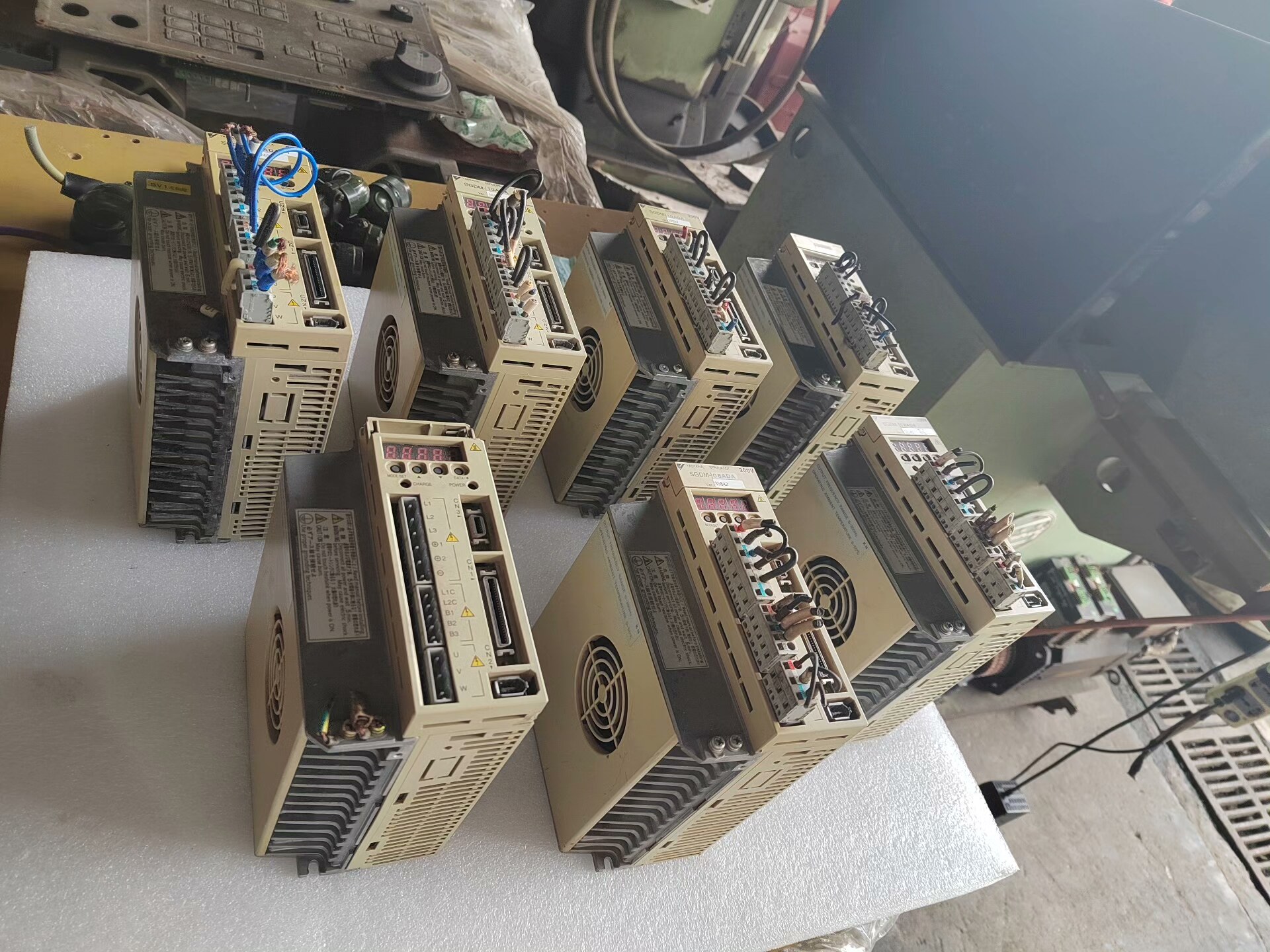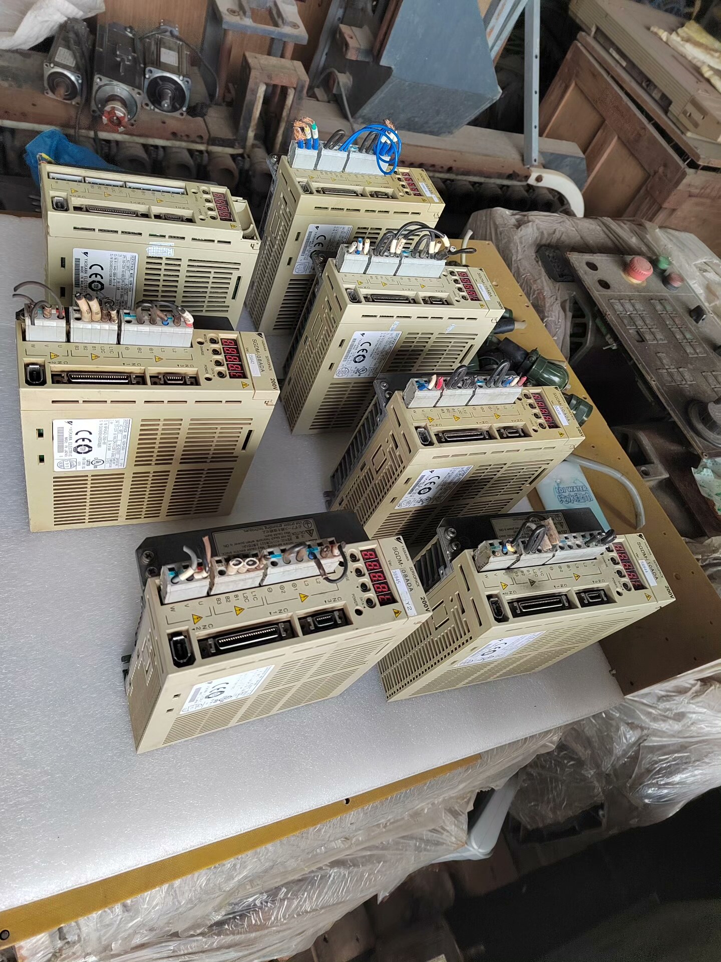 图片中展示了多台SGDM-08ADA和SGDM-10ADA驱动器,均为原厂正品,外观无明显损伤,接线端子完整,显示屏正常工作,符合“所见即所得”的销售承诺。