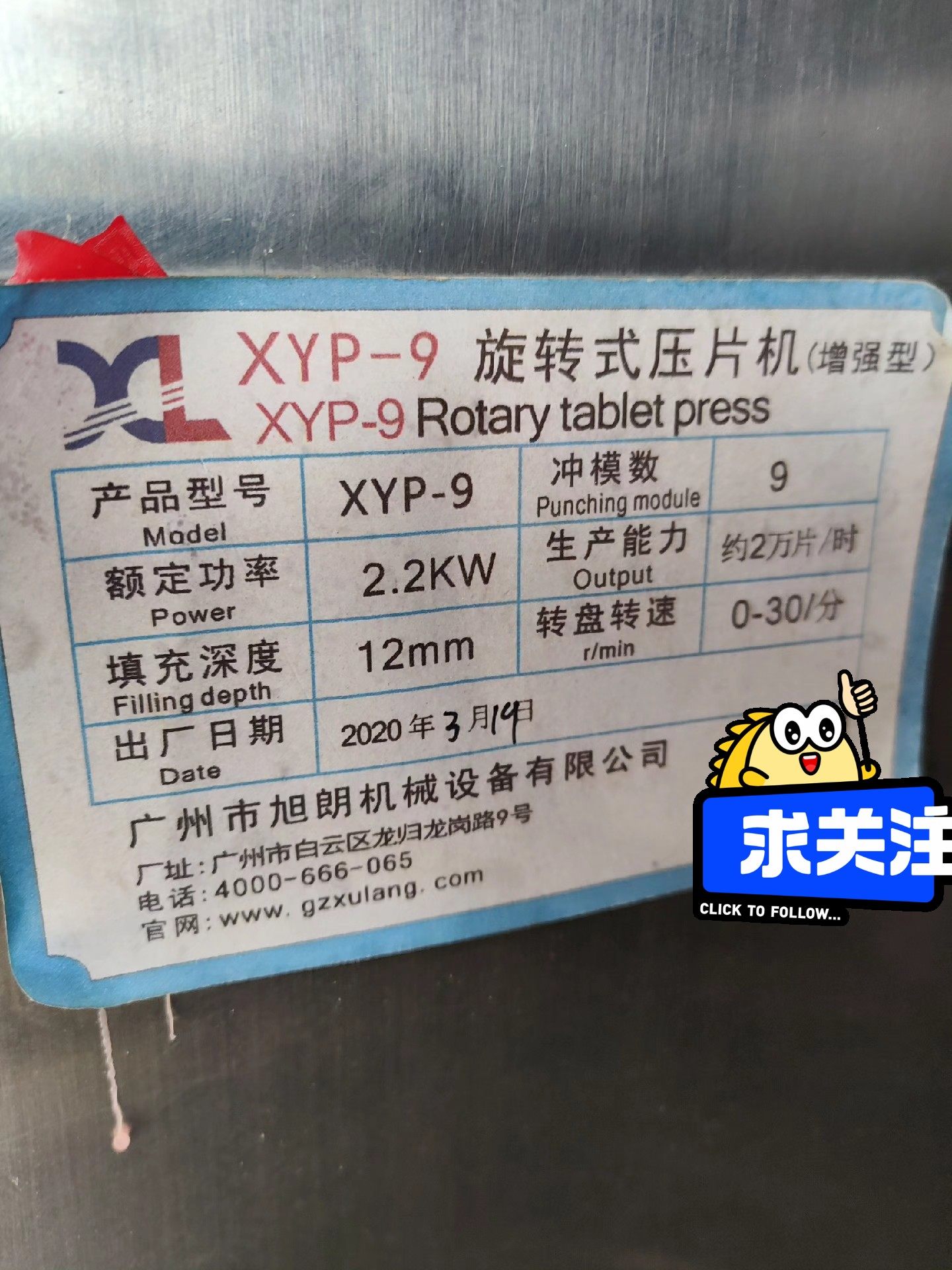 - XYP-9型号:功率2.2kw,生产能力2万片/h,填充深度12mm,2020年出厂