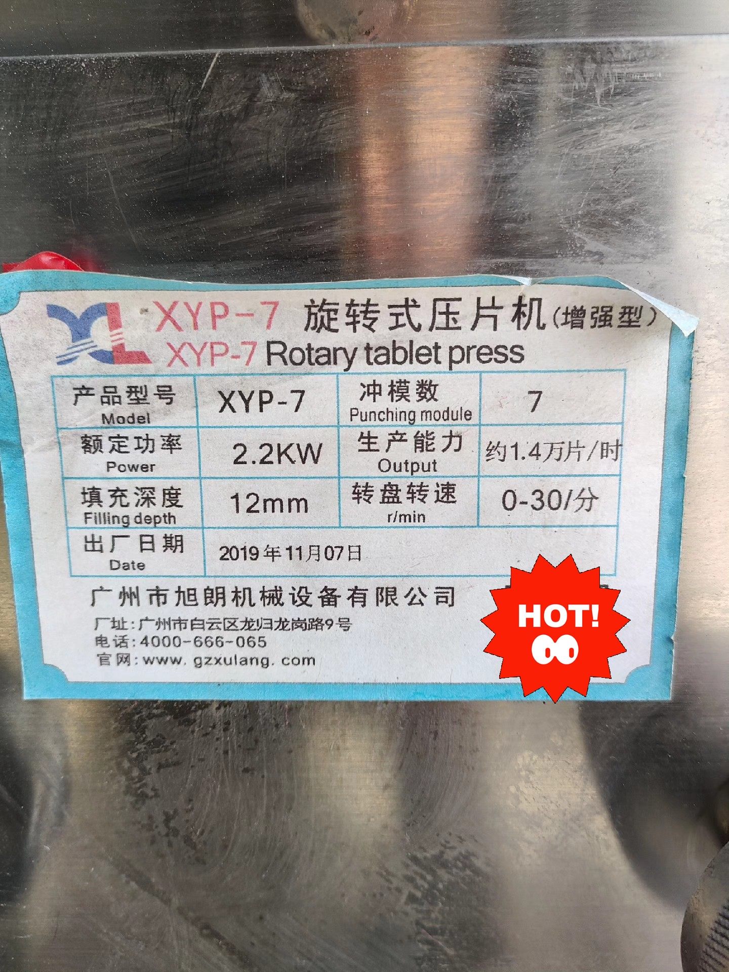 - XYP-7型号:功率2.2kw,生产能力1.4万片/h,填充深度12mm,2019年出厂