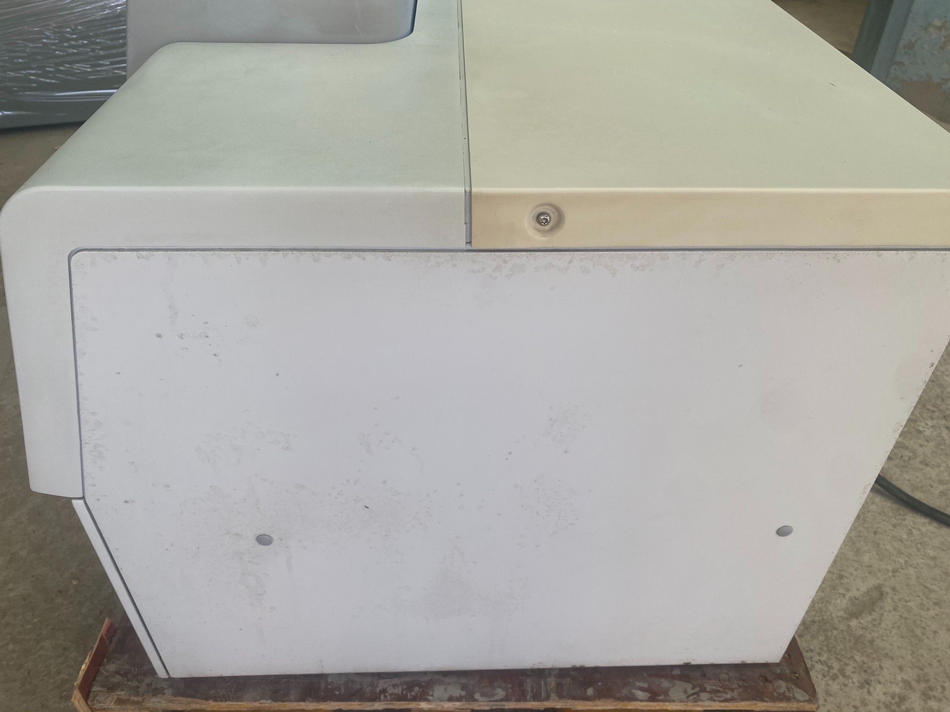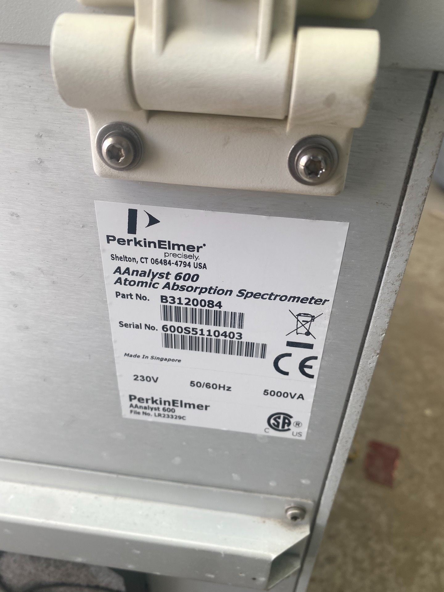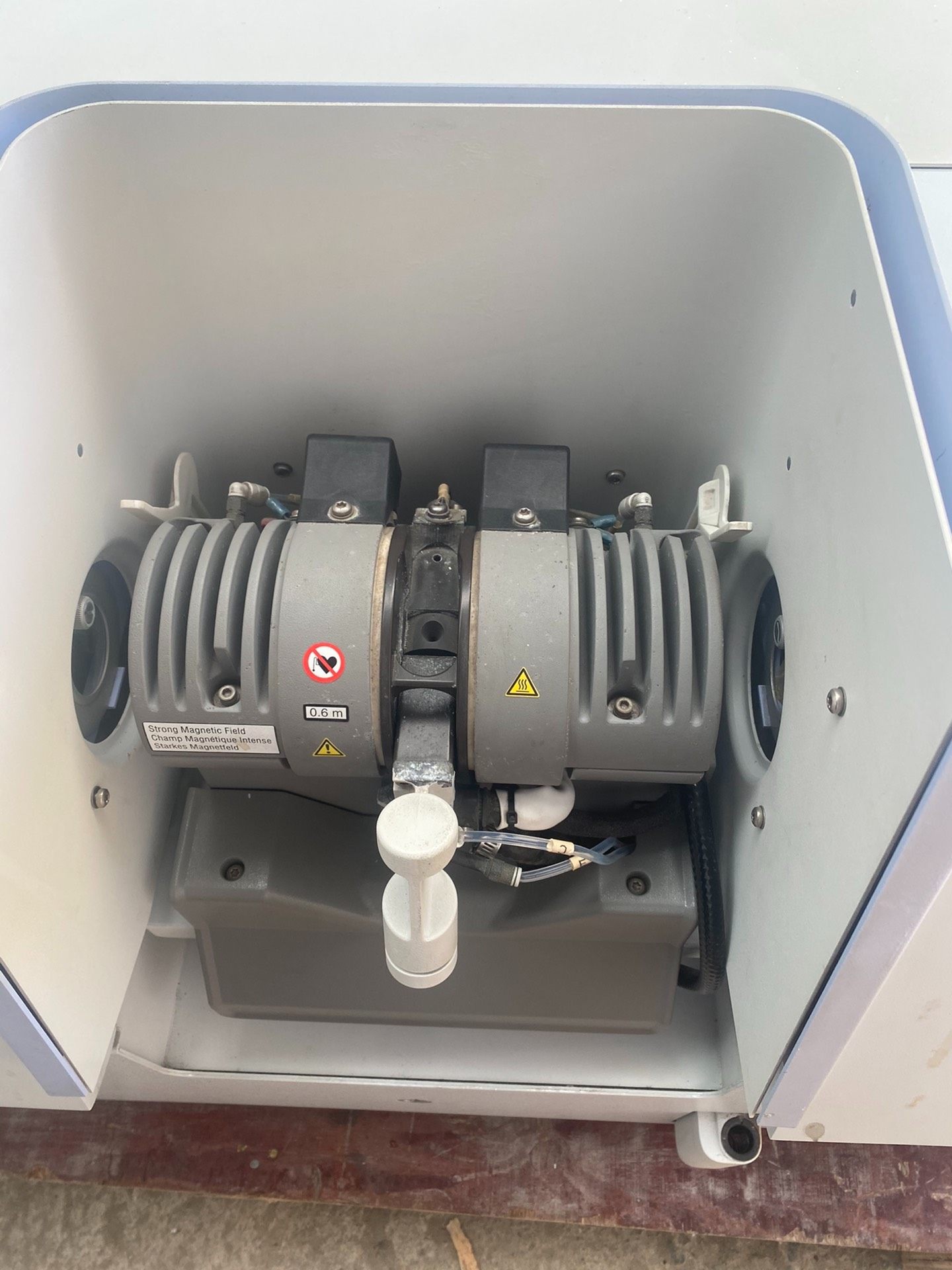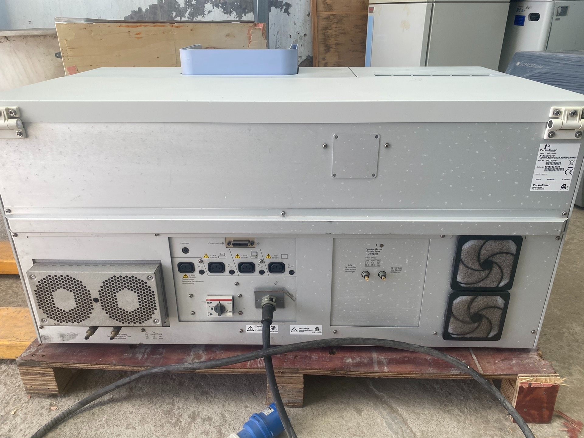 本设备为PerkinElmer PE 600型号石墨炉原子吸收光谱仪,主体采用灰色外壳设计,局部搭配蓝色装饰条,结构紧凑。设备内部可见石墨炉核心组件,包含两个圆柱形加热模块及必要的连接管路,表面贴有安全警示标识。据描述,设备开机自检功能正常,运行状态稳定,实物成色如图所示,无其他额外配件。