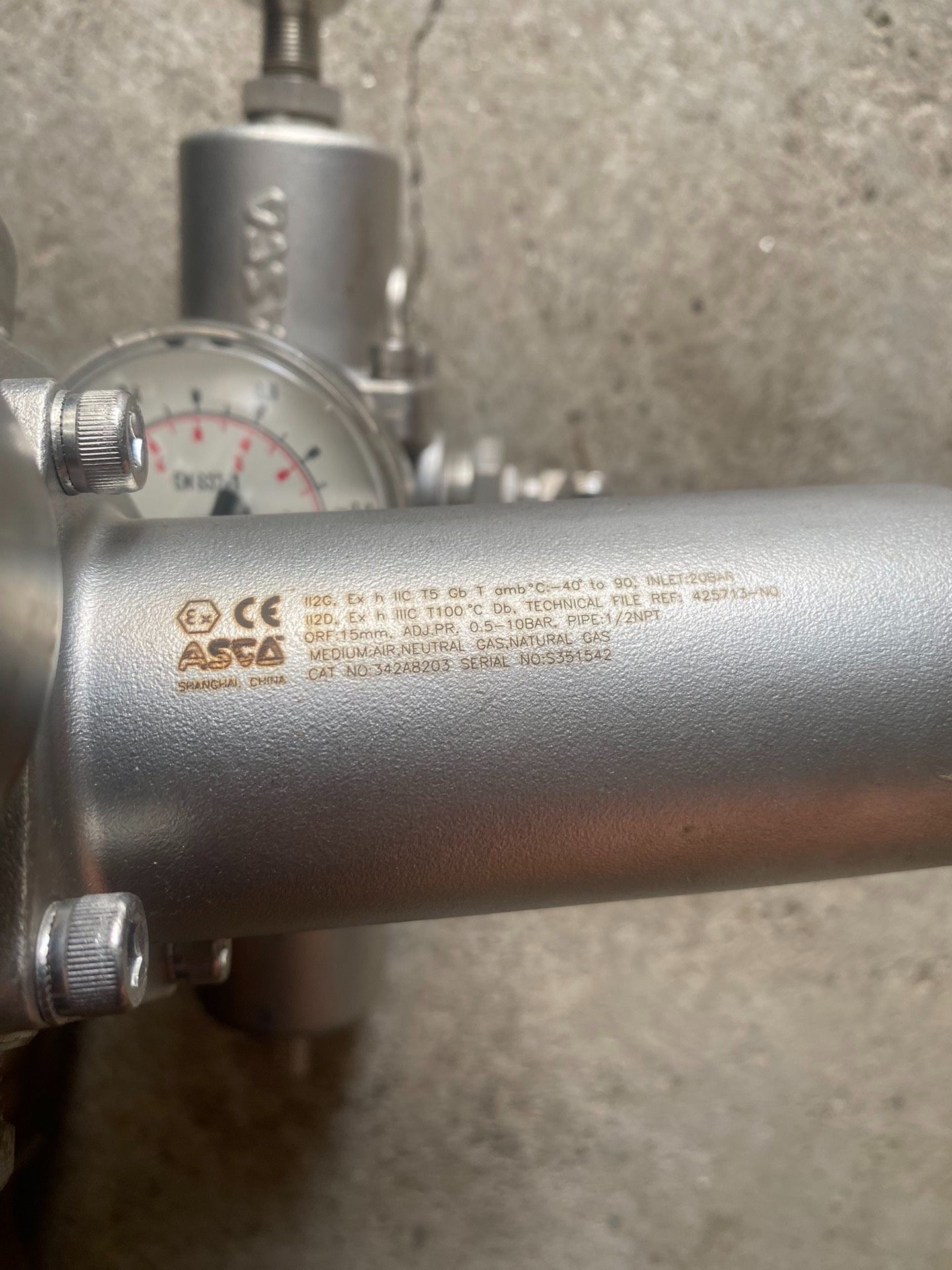 这款ASCO不锈钢减压阀,型号为342A8203,是专为工业自动化和气动系统设计的精密调压设备。它配备了WIKA品牌的高精度压力表,能够提供准确的压力读数,确保系统的稳定运行。